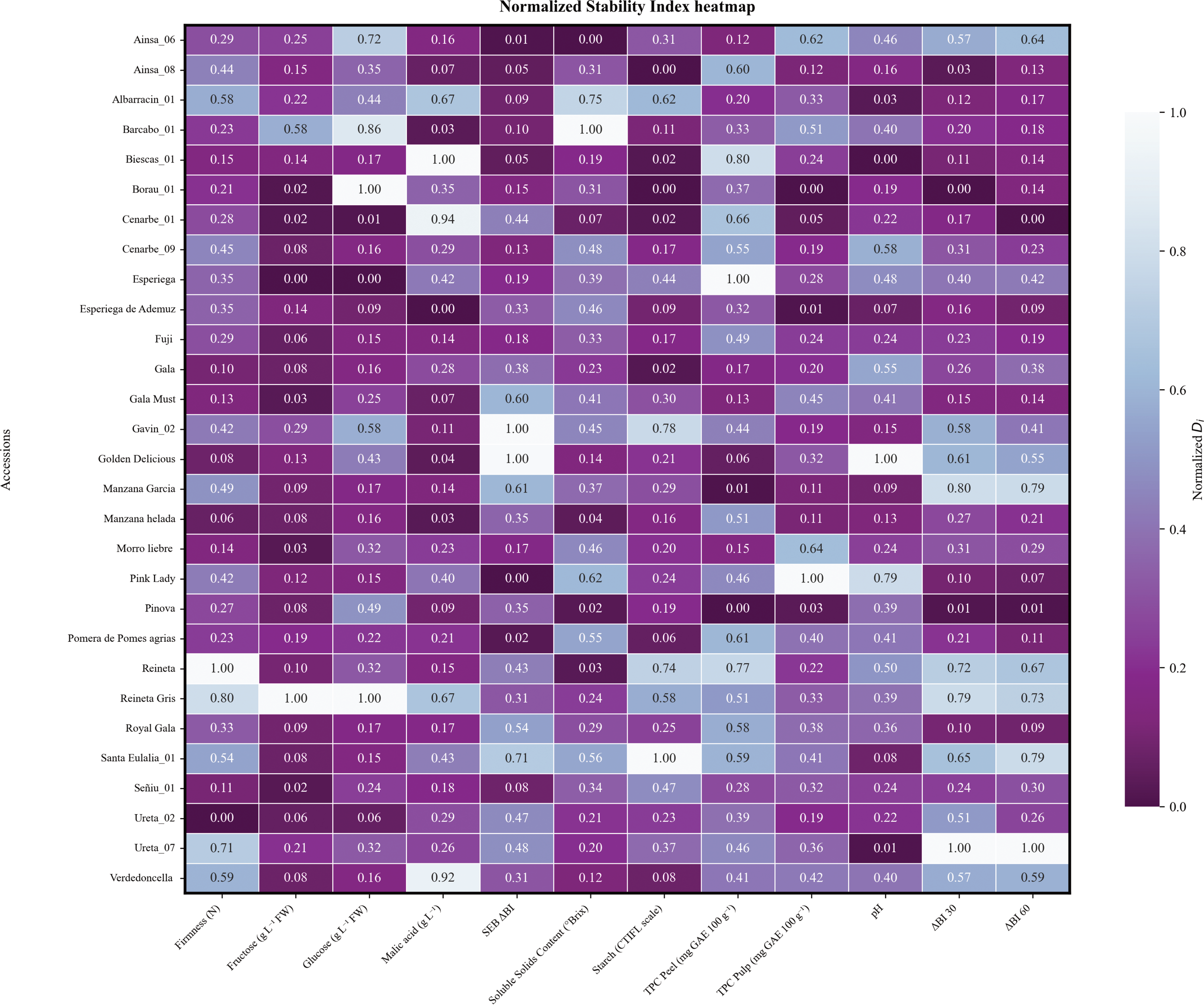 The enzymatic browning capacity of apple pulp halves from each germplasm collection was evaluated during the 2020 and 2021 growing season. Digital image analysis was conducted at oxidation time points of 0, 30, and 60 minutes. Enzymatic browning was calculated as the difference in browning index (ΔBI) from the time of cutting as ΔBI = BI0 - BIt (ΔBI 0–30 and ΔBI 0–60) along with oxidation speed index SEB_ΔBI as oxidative characteristics at the Universidad Pública de Navarra, enabling classification of accessions into clusters with varying oxidation susceptibility levels (Miranda et al., 2023).