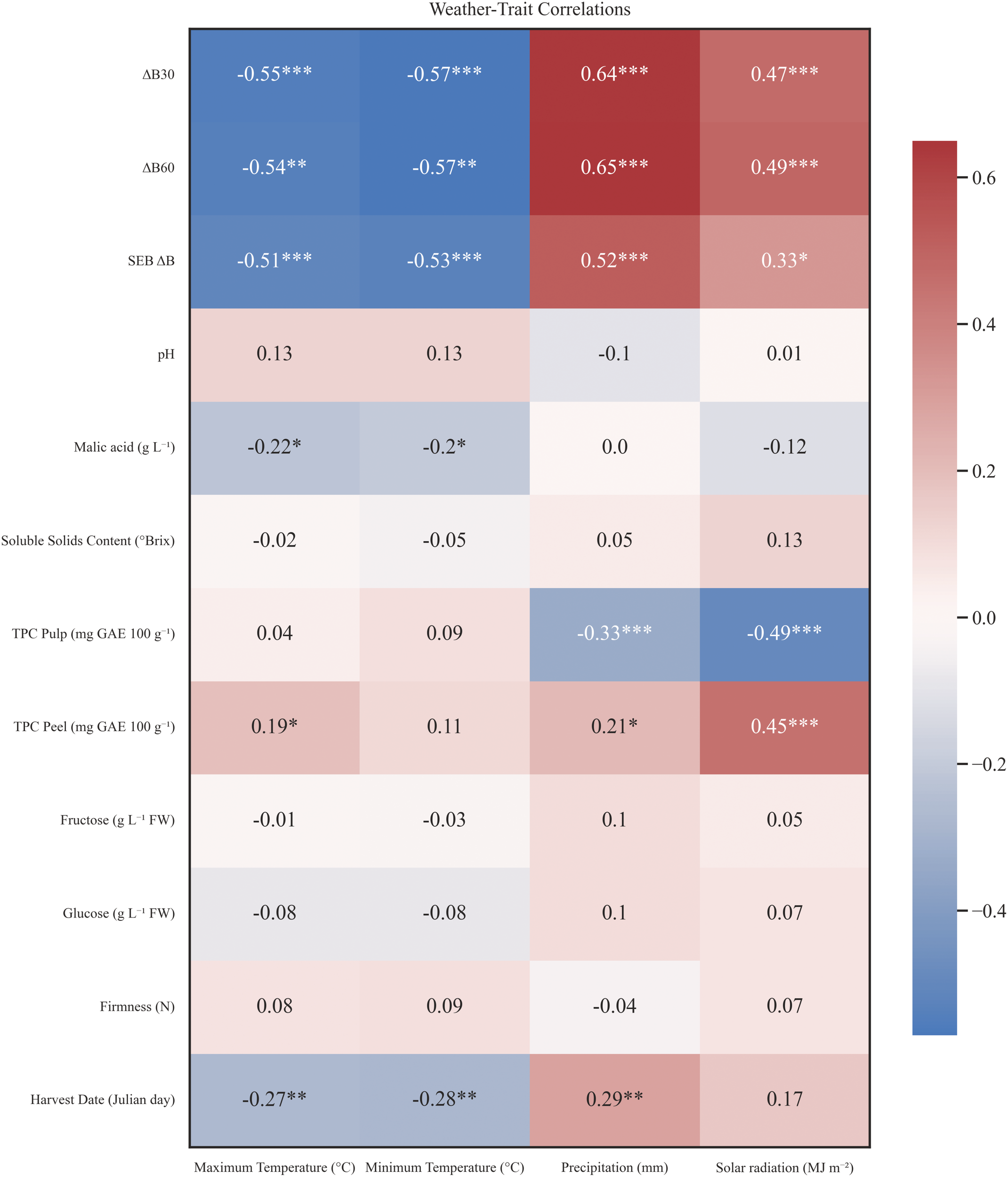 A correlation matrix was obtained calculating pearson’s correlation coefficient between 12 studied traits from 2020–2021 dataset. Strong correlations (> 0.80, p < 0.001) were observed between oxidation indexes ΔBI at 30 and 60 minutes and oxidation speed index SEB_ΔBI (Figure 3), as it was expected. However, when comparing their interactions with biochemical traits, oxidation indexes performed unexpectedly, showing no correlation between TPC in pulp and ΔBI values at 30 and 60 minutes of oxidation. Instead, ΔBI correlated positively with SSC (r = 0.3, p < 0.005). Surprisingly, speed oxidation rate SEB_ΔBI also correlated positively with malic acid content (r = 0.23, p < 0.05). In addition, both SEB_ΔBI and ΔBI values at 30 and 60 minutes correlated positively (r = 0.39, r = 0.41, r = 0.3, respectively, p < 0.001) with harvest date, pointing out that late-varieties tended to develop enzymatic browning faster and more notably. Harvest date also correlated positively with SSC (r = 0.43, p < 0.001), which was also related to ΔBI, indicating a strong relationship between late-harvest varieties with higher SSC and enzymatic browning susceptibility. Moreover, harvest date was also correlated positively with firmness (r = 0.22, p <0.05) which indicated that firmness was also higher for late ripening varieties (Figure 3).
