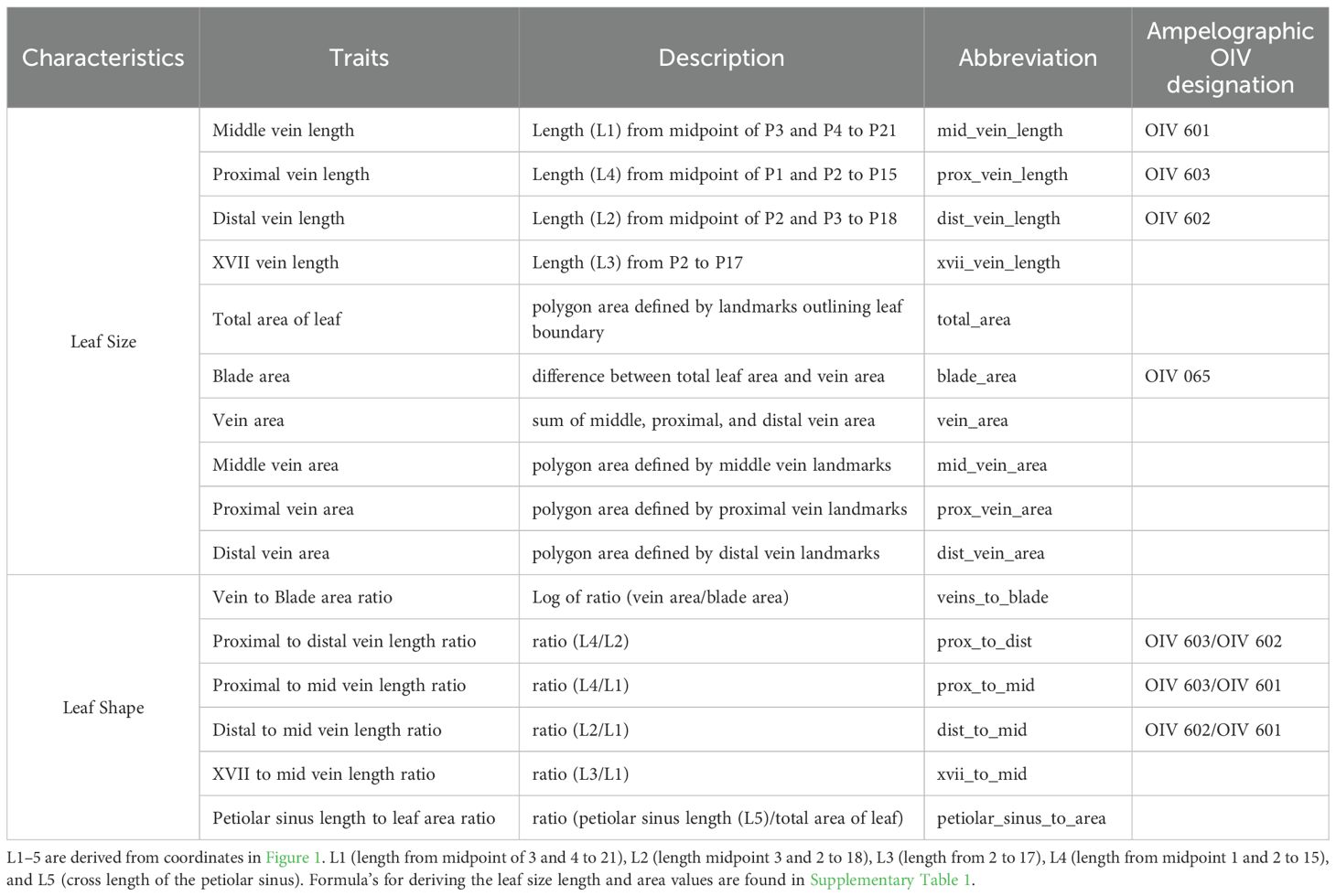 The ampelographic finite traits were derived using the 21 landmark coordinates. A total of 16 different phenotypes were obtained for each leaf sample, as outlined in Table 1. Distances between landmarks were also derived using the Pythagorean theorem (Maor, 2019). Ten phenotypes related to leaf size were computed, using the overall area of the leaf and the vein and blade area, utilizing the shoelace algorithm (Pure and Durrani, 2015). In addition, six different ratios were derived using area and length metrics as indirect measures describing proportion or pattern related to leaf shape.