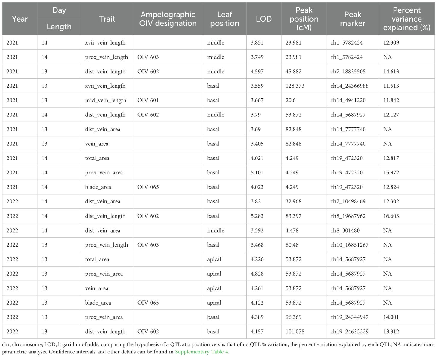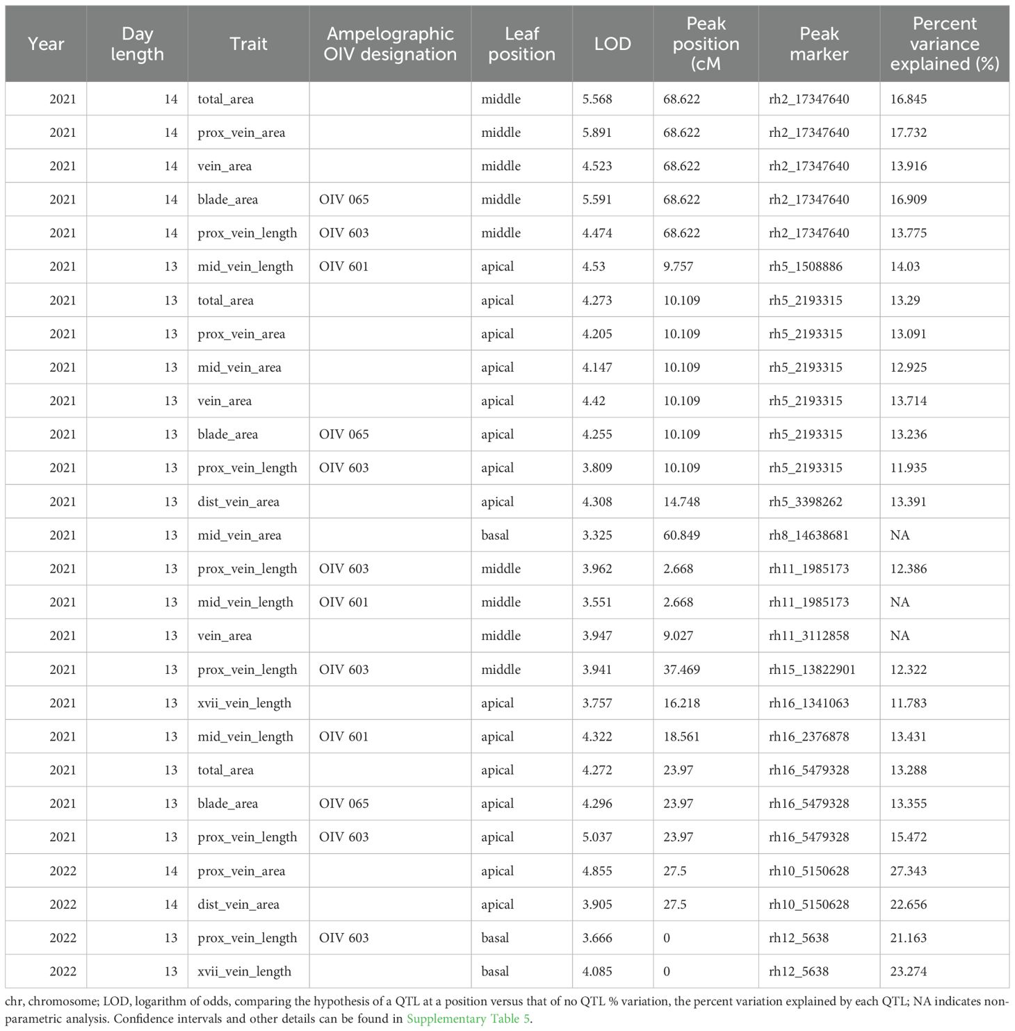 In contrast to the leaf size related traits, there were few QTLs identified for the leaf shape related traits. A total of 10 QTL were identified for own-rooted presentation with 5 QTL each for 2021 and 2022 (Table 4; Supplementary Table 7). The petiolar sinus to area trait was associated with QTL on different chromosomes in the own-rooted and grafted presentations with repeat hits on chromosome 1 for own-rooted and a QTL each on chromosome 2 and 4 for grafted presentation.