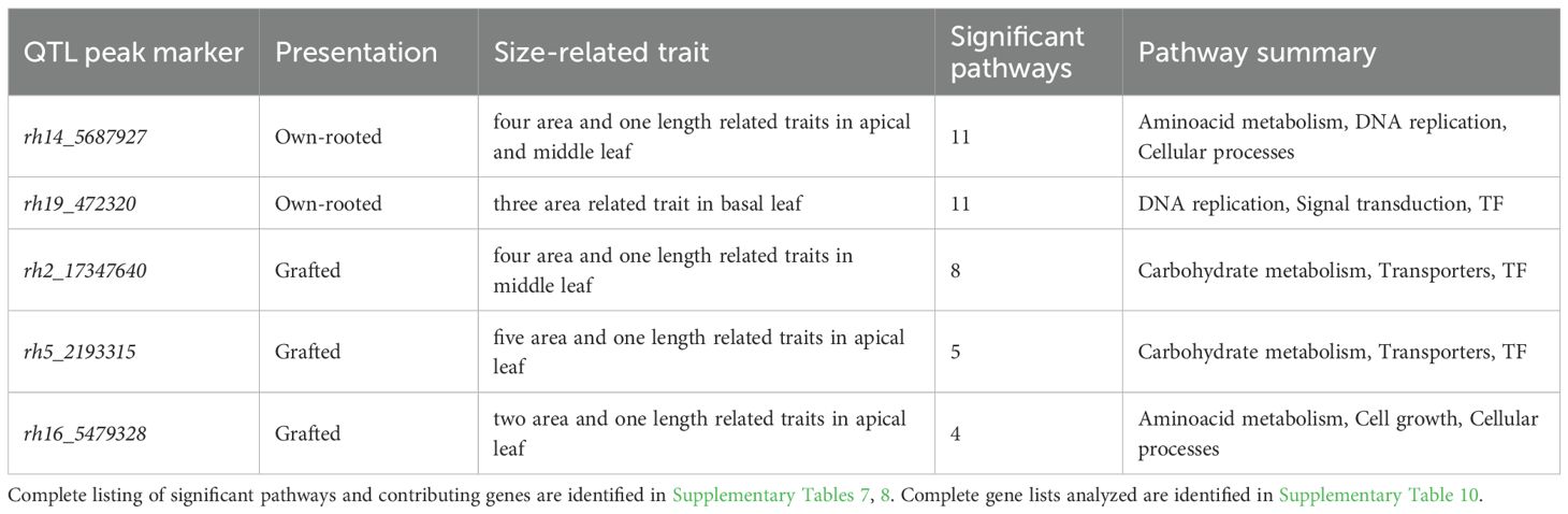 Five QTL hotspots, two in the own-rooted (rh14_5687927, rh19_472320) and three in grafted (rh2_17347640, rh5_2193315, and rh16_5479328) containing three or greater collocated QTL with identical peak markers were identified and pathway enrichment analyzed (Table 5). The QTL regions for the own-rooted QTL on chromosomes 14 and 19 identified 11 and 12 enriched pathways for DNA replication, amino acid metabolism, and transcription factors (Supplementary Table 8). In the grafted presentation there were eight, five, and 11 enriched pathways for hotspots on chromosomes eight, five, and 11 respectively (Supplementary Table 8). Transporters, transcription factors, and carbohydrate metabolism were found in these enriched pathways. The total lists of the genes analyzed for pathway enrichment can be found in Supplementary Table 9.