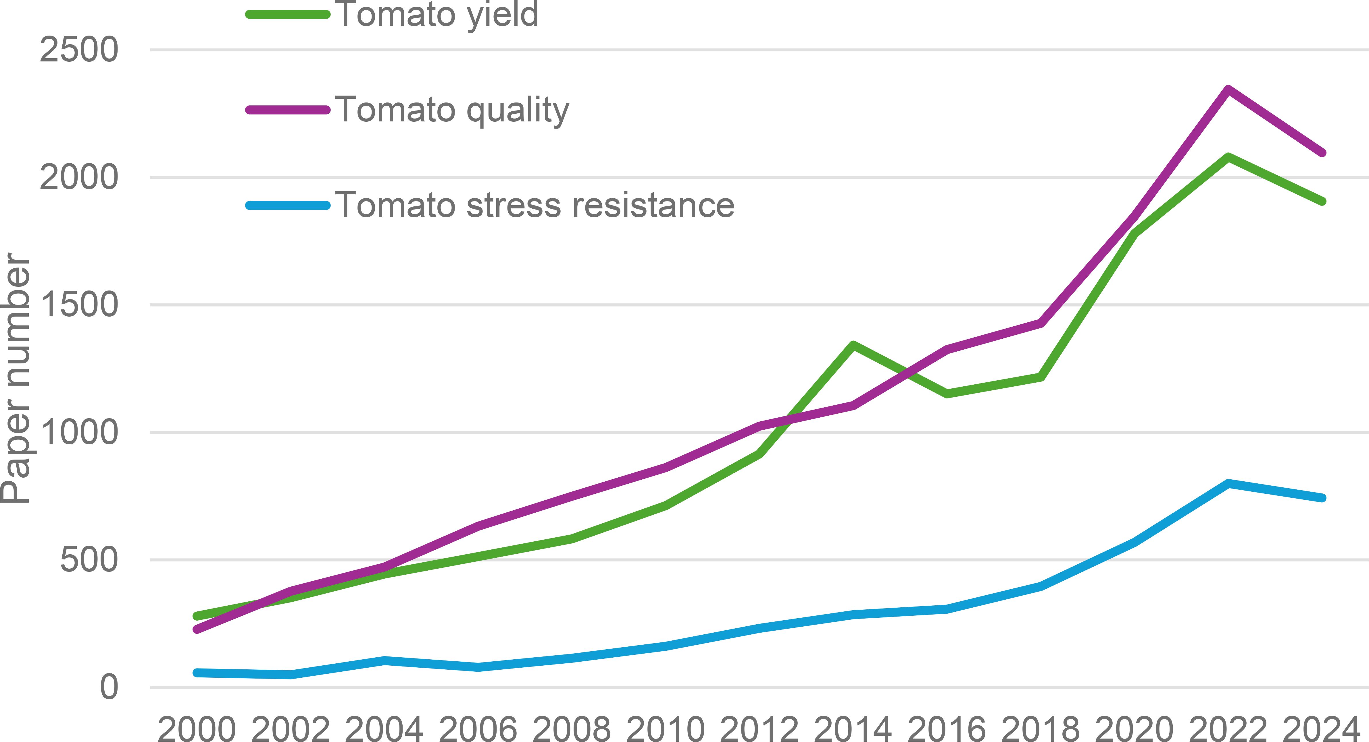 Figure 1. Annual counts of journal articles indexed in the Web of Science database from 2000 to 2024 containing the keywords “tomato yield,” “tomato quality,” and “tomato stress resistance.
