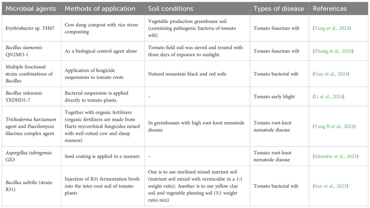 Cheraghi et al. (2023) demonstrated that in greenhouse experiments under high chemical fertilizer conditions, the combined application of vermicompost, PGPR and AMF significantly enhanced tomato root growth, zinc/iron uptake and soil respiration. This study systematically validated the synergistic mechanisms among organic inputs, microorganisms, root systems and plants at four interconnected levels. In addition, microbial agents have been used in tomato cultivation to control diseases (Tiwari et al., 2024; Zenelt and Krawczyk, 2025). Many microbial agents in tomatoes have exhibited considerable inhibition of wilt, green wilt, early blight, root-knot nematode, and bacterial wilt (Table 3). The primary parameters impacting microbial agents to enhance yields are complex and variable. Plant-growth-promoting inter-root bacteria (PGPB) produce various chemical compounds that diminish reliance on synthetic fertilizers and enhance tomato growth (Cochard et al., 2022). Beneficial soil fungi, specifically the fungal strains Trichoderma afroharzianum T22 and Funneliformis mosseae enhanced tomato yield by 13% and 15%, respectively (Minchev et al., 2024). These microorganisms are a viable sourceto diminish reliance on artificial fertilizers and pesticides by directly enhancing plant nutrient absorption and indirectly stimulating plant defense mechanisms. However, the field performance remains inconsistent due to variations in environmental conditions, soil microbiomes, and farming practices.