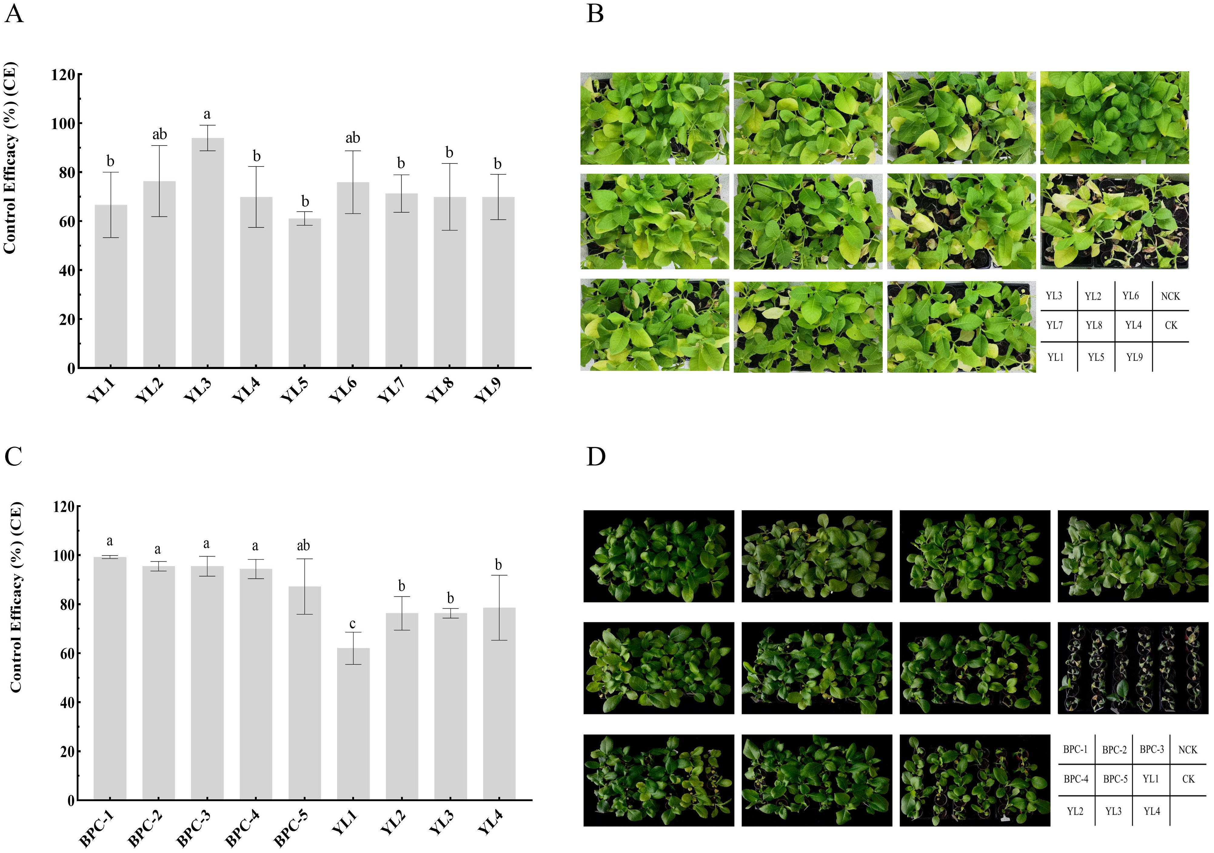 Figure 1. Control efficiency of phages and phage cocktails against BW in pots. (A, B) show the evaluation of single-phage biocontrol potential; (C, D) show the control efficacy of phage cocktails against tobacco BW inoculation with three R. pseudosolanacearium strains. Letters in the bar chart indicate significant differences according to Duncan’s analysis (P ≤ 0.05); NCK is the negative control group.