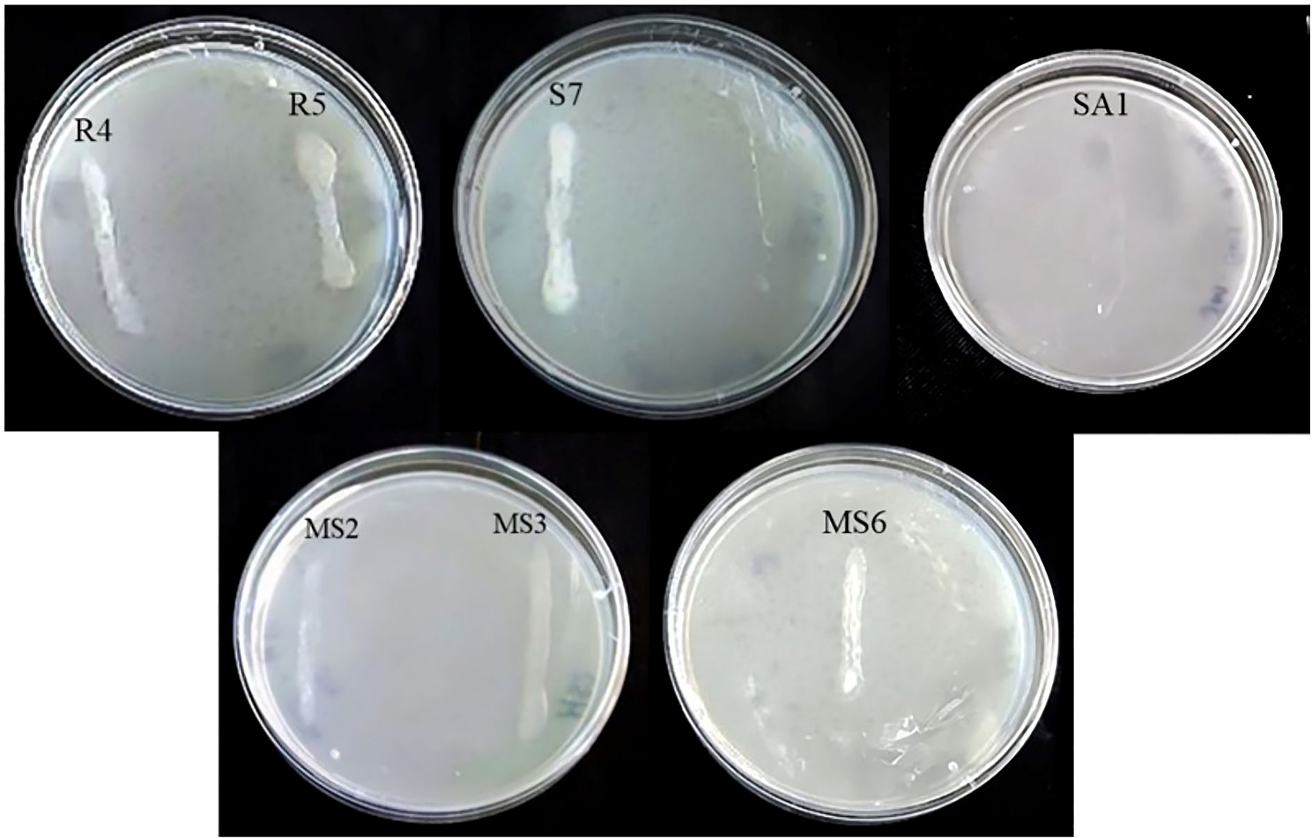 Invitro assays revealed that, 14 isolates produced the phytohormone IAA, 23 isolates produced ammonia, 15 isolates were observed to solubilize phosphate, 3 isolates were identified to produce HCN, and 5 isolates were observed to produce siderophore. Based on the qualitative analysis of PGP properties, 7 of the 26 isolates (designated as R4, R5, S7, SA1, MS2, MS3, and MS6) (Figure 2) exhibited the most promising results for maximum PGP activities and were selected for further analysis of hydrolytic enzyme production, antagonistic activity, and germination assay.