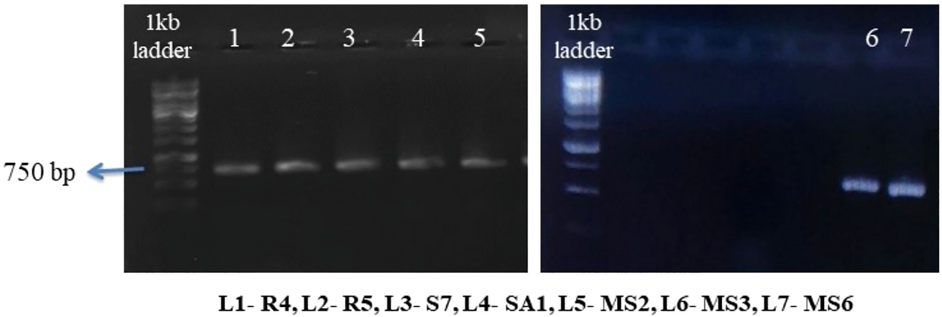 The chosen bacterial strains underwent molecular characterization through 16S rRNA sequencing (Figure 9). The resulting sequences were submitted to the NCBI GenBank BLAST (Basic Local Alignment Search Tool) Nucleotide database. Sequences were submitted to the NCBI GenBank database with the following accession numbers (Table 4): R4-Enterobacter hormaechei(OP962461), R5-Bacillus siamensis (PP708989), S7-Pantoea agglomerans (OP962463), SA1-Staphylococcus gallinarum (OP962464), MS2-Bacillus amyloliquefaciens(OP954871), MS3-Bacillus velezensis(PP702344), and MS6-K. Sacchari (PP702289).