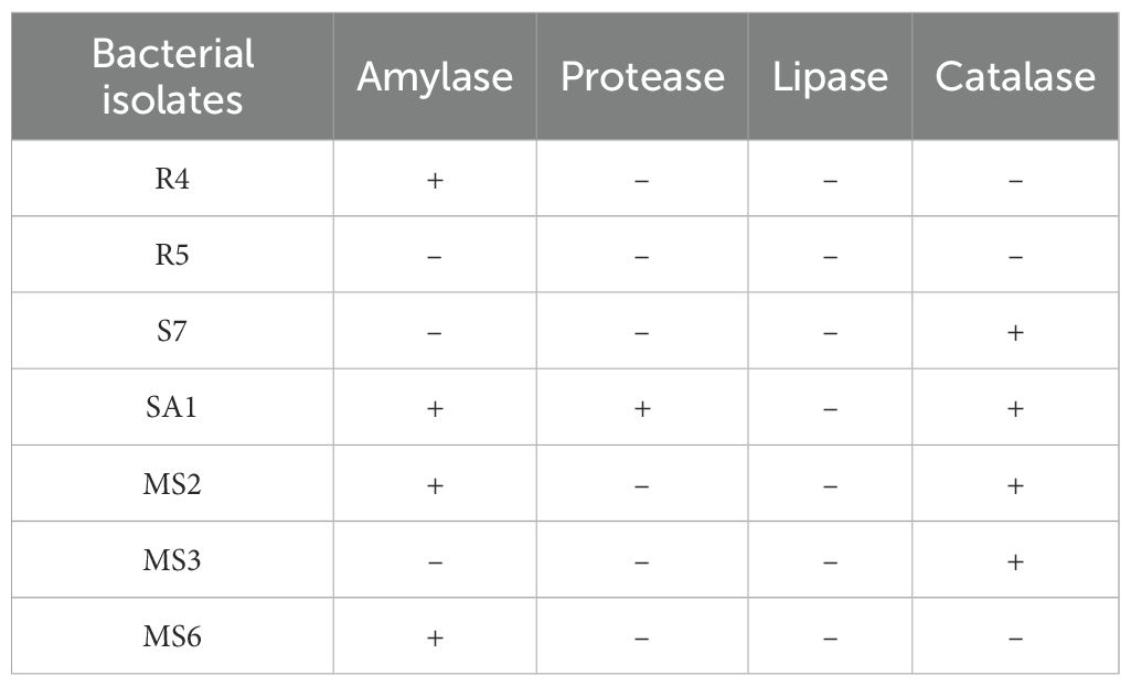 Hydrolytic enzymes, such as protease, amylase, chitinase, lipase, and cellulase, act as defenders to protect plants from diseases by degrading the cell wall of the plant’s pathogenic microorganisms (Zerihun et al., 2019). PGPB with the potential to produce one or more of these lytic enzymes can exhibit biocontrol against plant diseases caused by harmful phytopathogenic bacteria and fungi (Rasool et al., 2021). Sritongon et al. (2023) demonstrated a comparable result, that the PGPR Bacillus subtilis produced significant production of amylase and protease. The enzyme chitinases strengthen plant defense by targeting chitin, the primary structural component of fungal cell walls, thereby inactivating pathogenic fungi without harming the host plant. In addition to enhancing resistance, these enzymes also contribute to improved plant growth and yield (Kumar et al., 2018). The genus Serratia and Halomonas are reported to produce a range of hydrolytic enzymes, cellulases, amylases, lipases, proteases, ureases, and chitinases (Ouali et al., 2024).