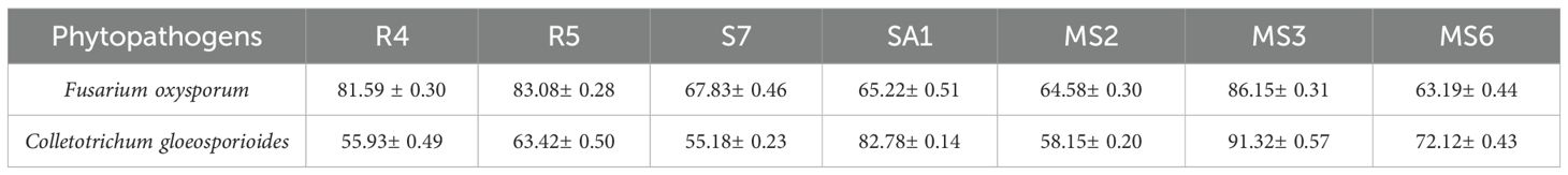 In the present study, based on the dual culture technique, all 7 bacterial isolates demonstrated the capacity to suppress the mycelial growth of the plant pathogens F.oxysporum and C.gloeosporioides, with varying degrees of efficacy. These two phytopathogens cause Fusarium wilt, Fusarium crown, and root rot (McGovern, 2015) and anthracnose (Lassois and de Bellaire, 2014) in crop plants. The antifungal activity of the bacterial strains R4, R5, S7, SA1, MS2, MS3, and MS6 exhibited a range of percent inhibition values against the pathogens, with values ranging from 63.19% to 86.15% for F. oxysporum and 55.18% to 91.32%for C. Gloeosporioides (Figures 6, 7). The highest antagonism was observed in MS3 (B. velezensis) against F. oxysporum with an inhibition rate of 86.15%, followed by R5 (B. siamensis) 83.08%, R4 (E. hormaechei) 81.59%, S7 (P. agglomerans) 67.83%, SA1 (S. gallinarum) 65.22%, MS2 (B. amyloliquefaciens) 64.58%, and MS6 (K. sacchari) 63.19%.The antagonistic activity of C.gloeosporioides was more pronounced in MS3 (B. velezensis) 91.32%, SA1 (S. gallinarum) 82.78%, MS6 (K. sacchari) 72.12%, R5 (B. siamensis) 63.42%, MS2 (B. amyloliquefaciens) 58.15%, R4 (E. hormaechei) 55.93%, and S7 (P. agglomerans) 55.18% (Table 3; Figure 8).