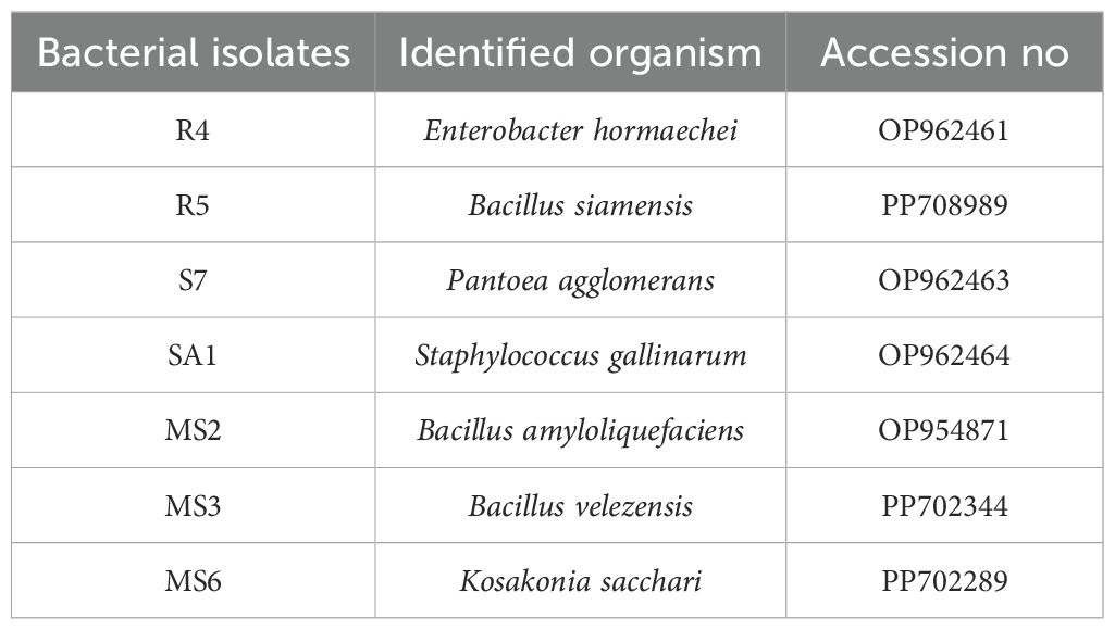 Sequences were submitted to the NCBI GenBank database with the following accession numbers (Table 4): R4-Enterobacter hormaechei (OP962461), R5-Bacillus siamensis (PP708989), S7-Pantoea agglomerans (OP962463), SA1-Staphylococcus gallinarum (OP962464), MS2-Bacillus amyloliquefaciens (OP954871), MS3-Bacillus velezensis (PP702344), and MS6-K. Sacchari (PP702289).