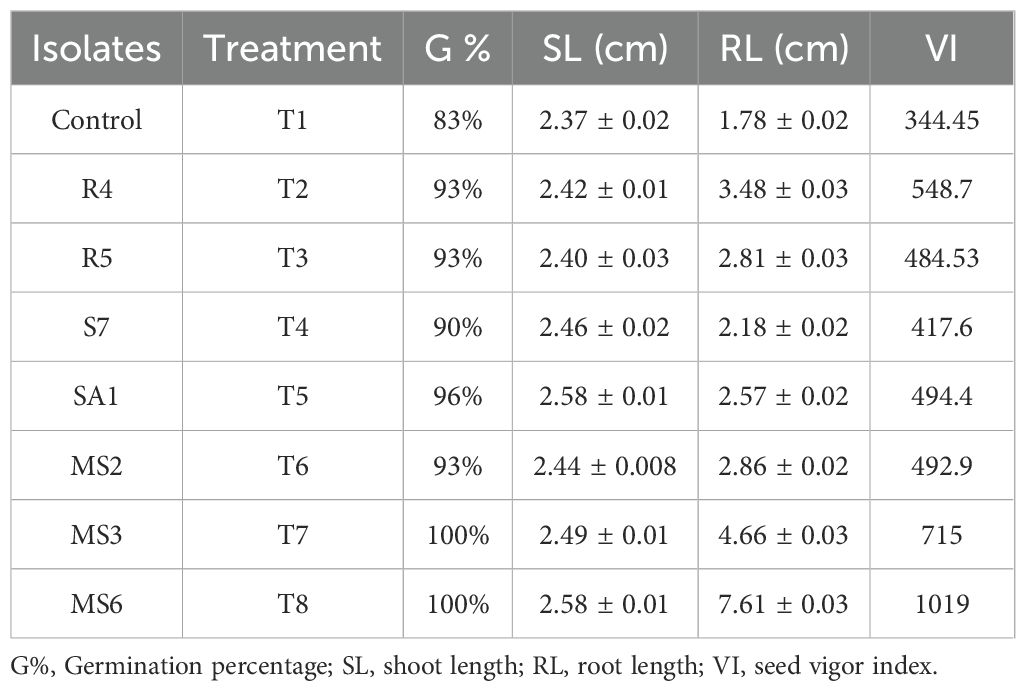 The surface-sterilized seeds were bioprimed with the seven bacterial isolates (108 CFU mL−1) separately in a sterile tube for 1 hour at a 180-rpm orbital shaker. A control set of surface-sterilized seeds was prepared by soaking them in autoclaved distilled water. Subsequently, the bioprimed and control seeds were placed on a sterile Petri plate containing wetted sterile cotton. Each plate contains 10 seeds, with three replicates per treatment. The seeds were observed for seed germination over a period of 10 days. The seed germination percentage (G%) and seed vigor index (VI) were calculated using the following formula, as outlined by Fahsi et al. (2021).