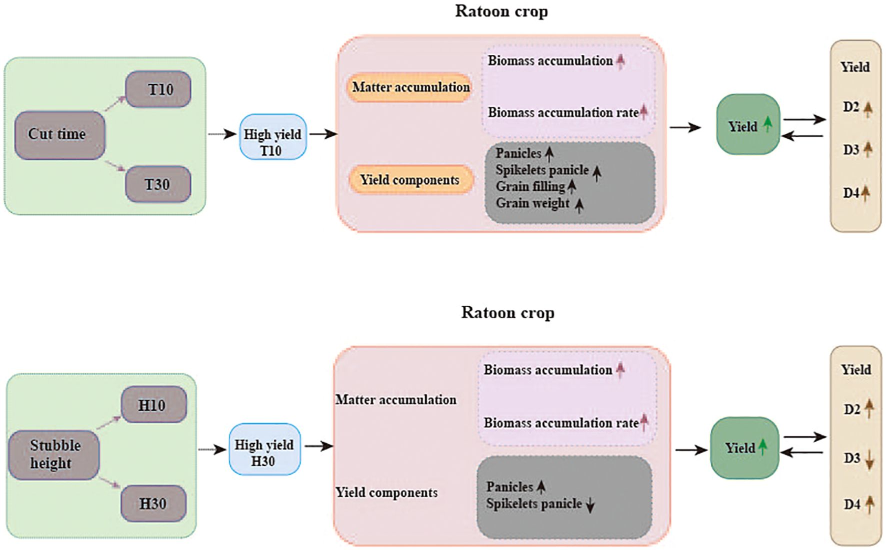 Results: The results showed that the average grain yield of T10 was 80.48% higher than that of T30, while the average grain yield of H30 was 21.77% higher than that of H10. Analysis revealed that the higher yield of T10 could be attributed to the panicle per square meter and the grain filling, while the higher yield of H30 could be attributed to the panicle per square meter. Analysis also revealed that the panicle per square meter and the grain filling of regenerated tillers at different nodes in T10 were higher than those in T30, while the yield performance of regenerated tillers at different nodes in H was more complex. Further analysis revealed that, under the H30 treatment, the grain yield generally followed the order D4 > D3 > D2, with D3 and D4 contributing approximately 84.80% of the total yield on average. In contrast, under the H10 treatment, D3 exhibited a higher yield than D4, with D3 contributing approximately 58.05% of the total yield. Notably, the D3 yield under H10 was higher than that under H30, while D4 showed the opposite trend.