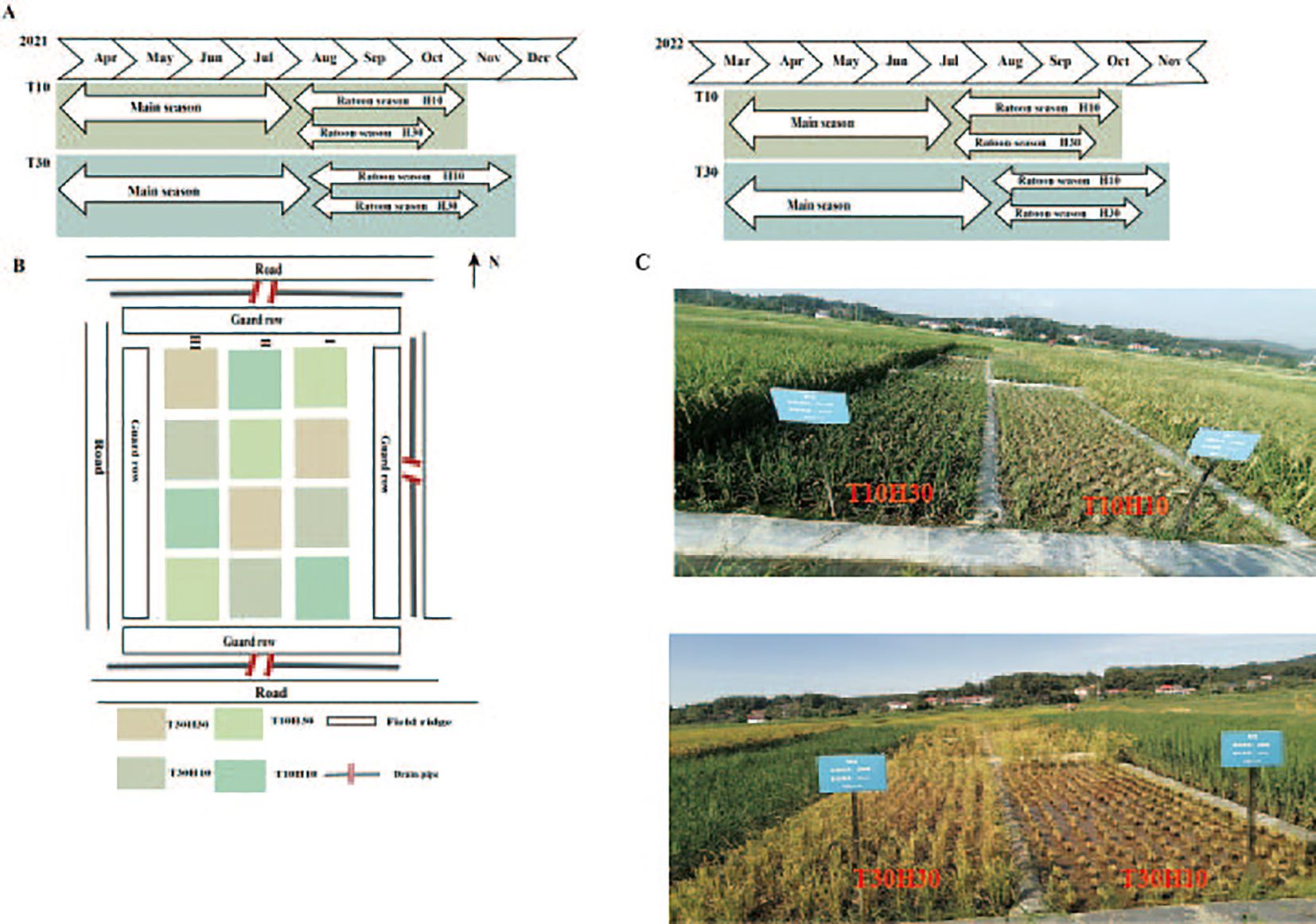 In 2021, the MC cutting times for T10 and T30 were on August 2 and August 22, respectively. In 2022, the MC cutting times for T10 and T30 were on July 24 and August 13, respectively. For the ratoon season, the harvesting times in 2021 and 2022 were as follows: T10H10, November 12 and October 20; T10H30, October 25 and October 10; T30H10, December 4 and November 14; and T30H30, November 23 and November 3 (Figure 1A) (Gai et al., 2024).