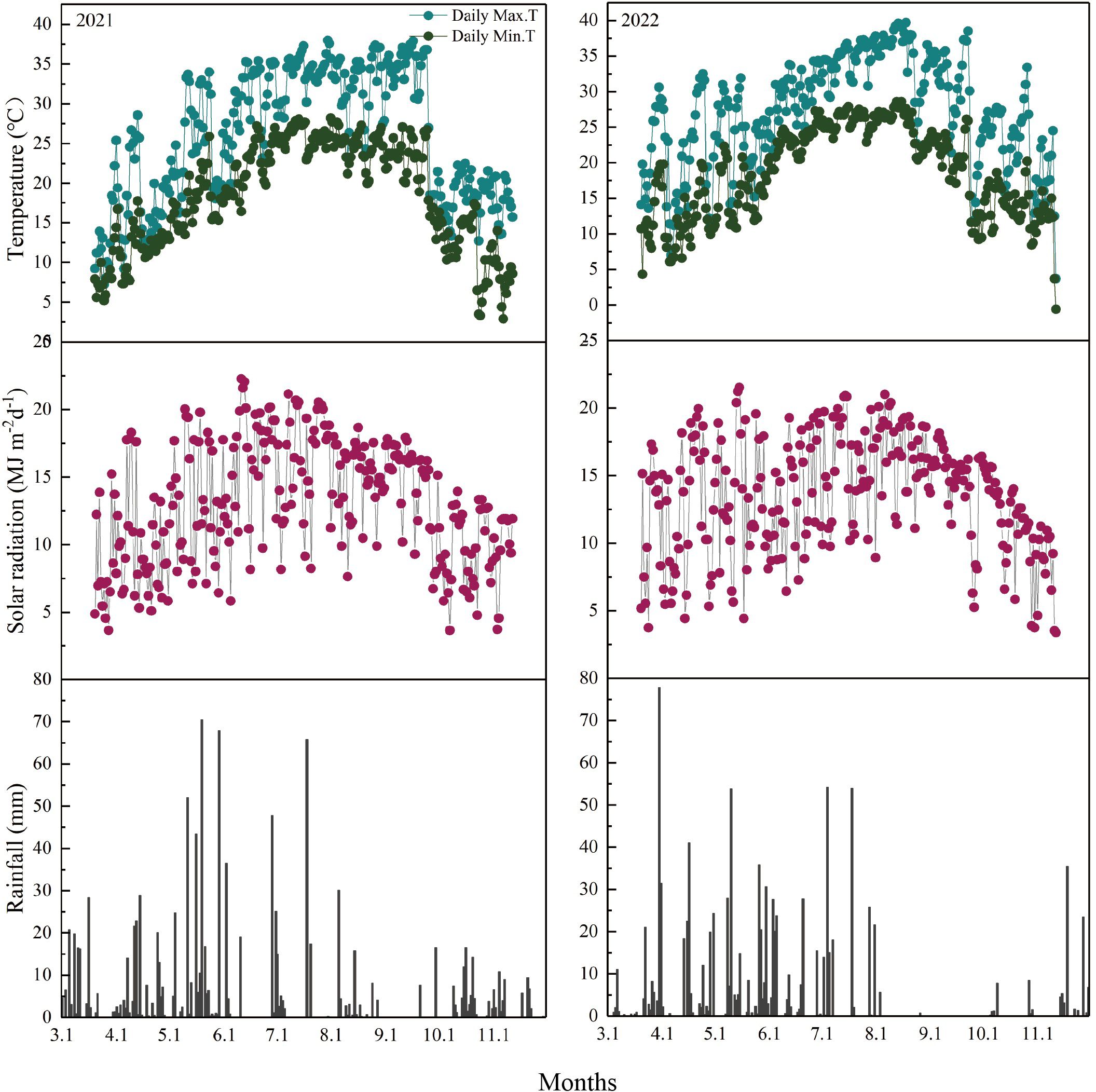 Figure 2. Daily maximum and minimum temperatures, solar radiation, and precipitation during the rice growing season from the transplanting of the main crop to the maturity of the ratoon crop at Changsha County, Hunan Province, Central China, in 2021 (left) and 2022 (right) (Gai et al., 2024).