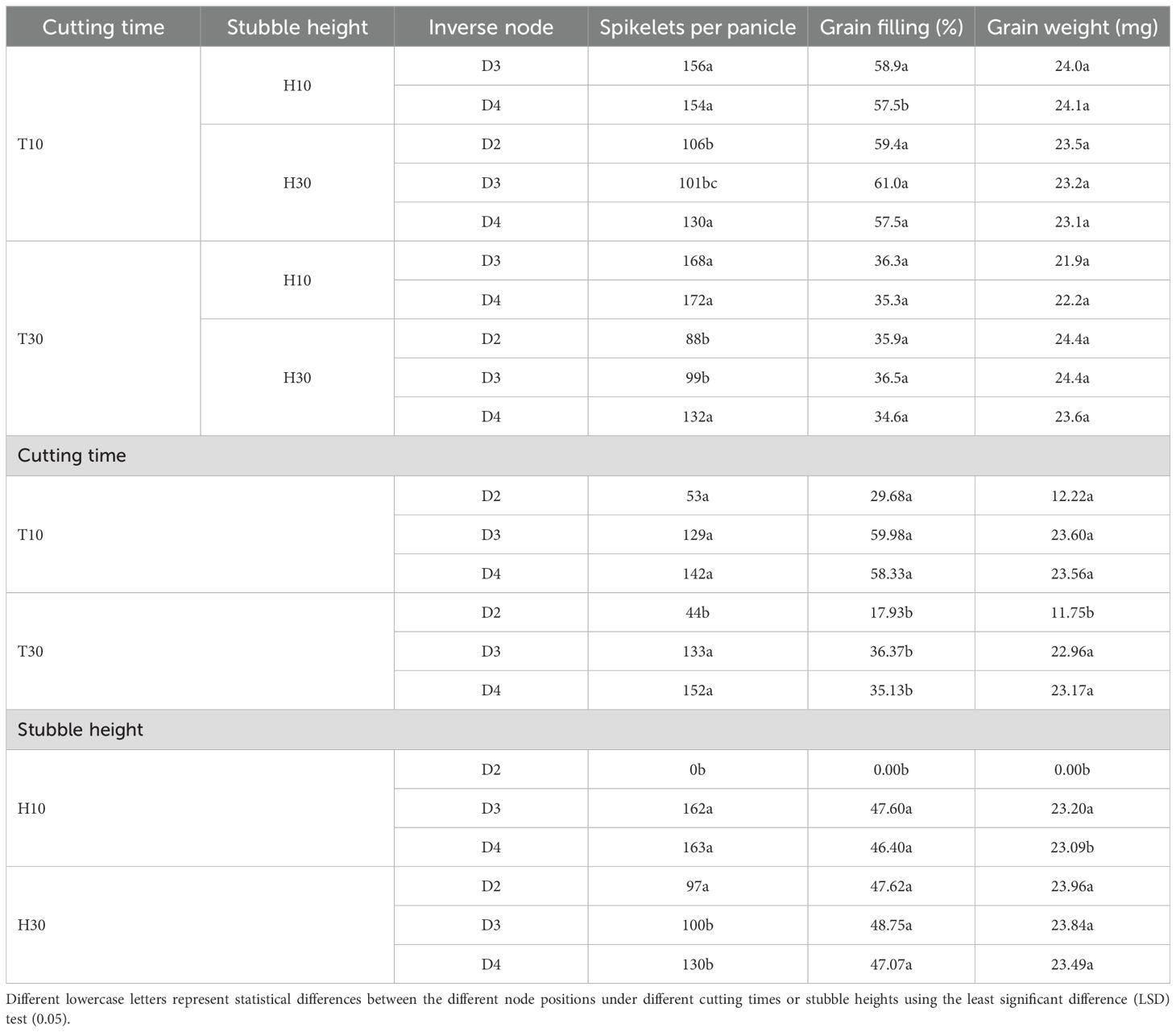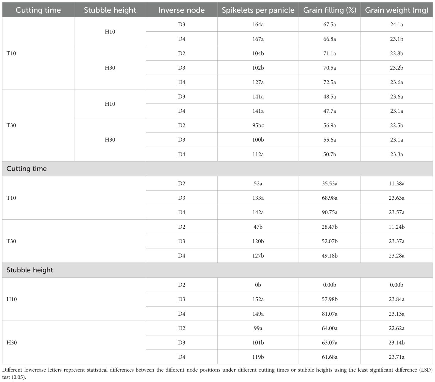 Table 1. Yield-related traits of ratoon tillers in the second, third, and fourth nodes (D2, D3, and D4, respectively) from the top of the ratoon crop (RC) at different cut stages and stubble heights in 2021.