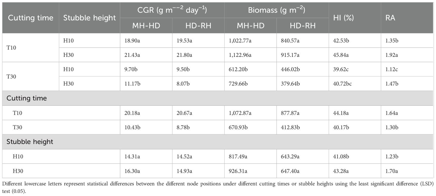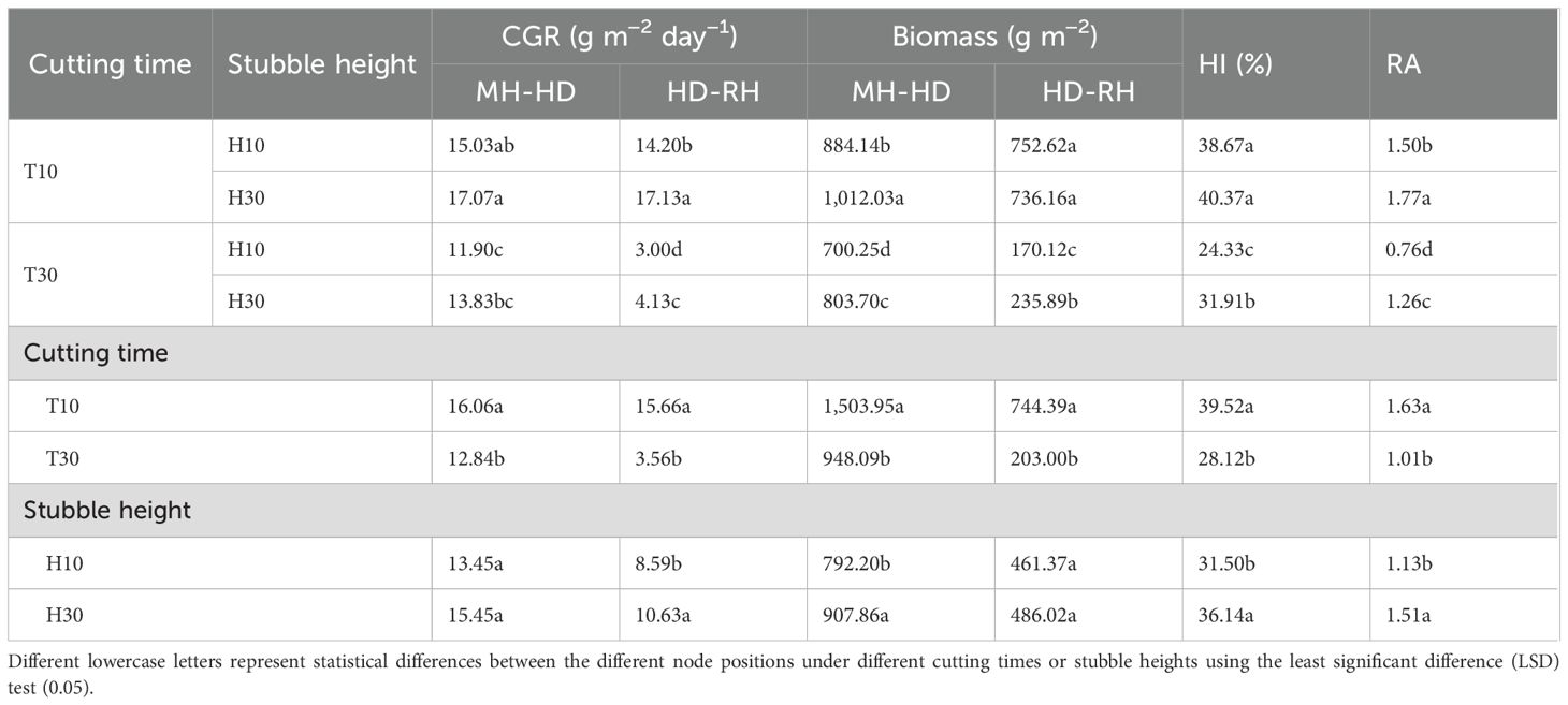 Table 4. Crop growth rate (CGR), biomass accumulation from the main crop (MC) harvest (MH) to the ratoon crop (RC) heading (HD) and from HD to the RC harvest (RH), harvest index (HI), and ratooning ability (RA) of XLY900 in the 2022 ratoon season.