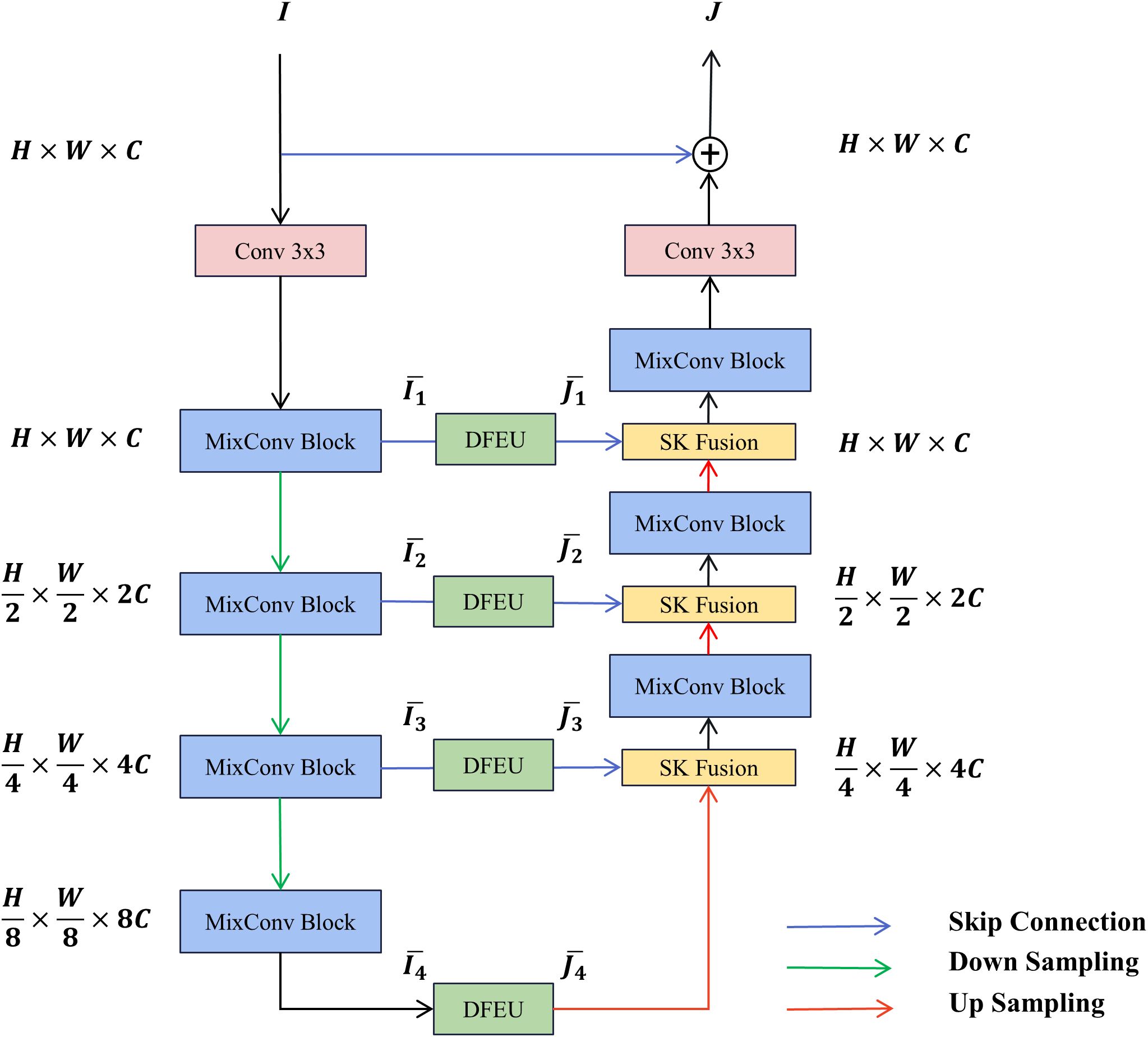 The DUNet model utilizes the MixConv module for feature extraction at every stage. A dehazing feature extraction unit (DFEU), based on the atmospheric scattering model, is inserted between the encoder and decoder to extract fog-free features. The decoder employs the SK fusion module to dynamically combine feature representations from multiple paths. The overall architecture of DUNet is depicted in Figure 2. The blurry image first passes through the MixConv module and a downsampling encoder to extract multi-scale blurry image features within the feature space, where is 1, 2, 3, or 4. Subsequently, the dehazing feature extraction unit extracts fog-free features , where is 1, 2, 3, or 4. Subsequently, the SK fusion module combines the feature maps extracted by the encoder’s downsampling and those upsampled and restored by the decoder. The MixConv module decodes the fog-free features into a final dehazed image. Finally, a global residual operation is applied to the blurry image to produce the final dehazed image .