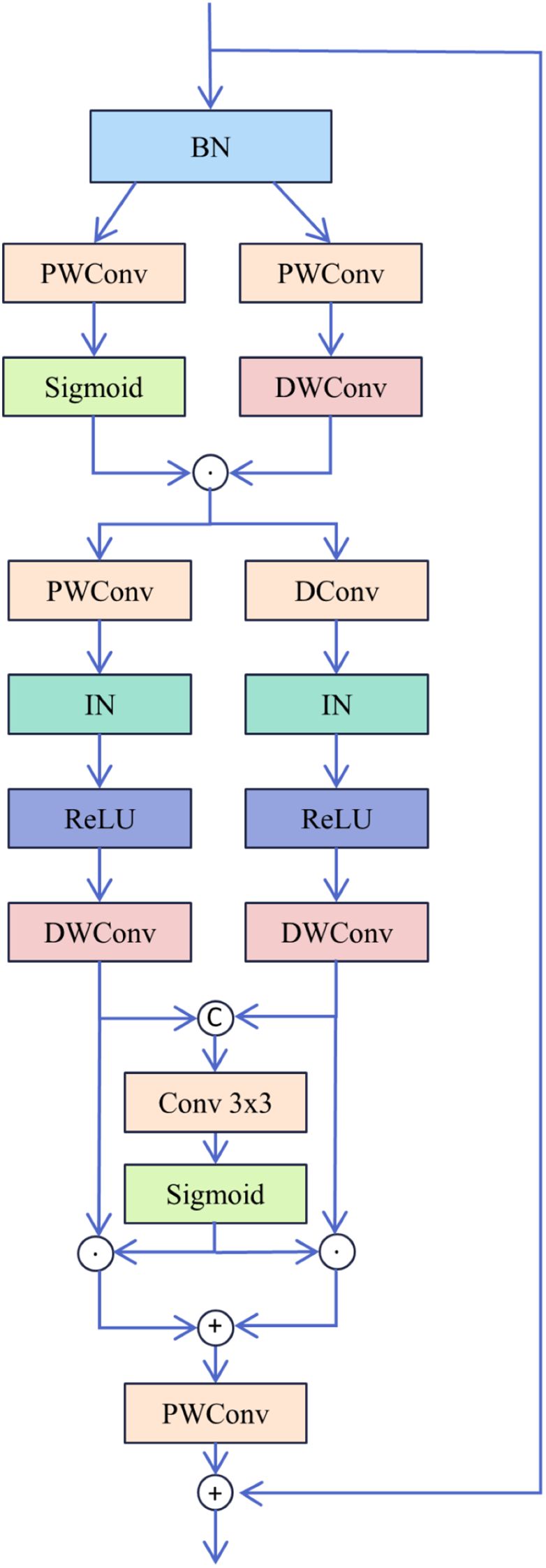 The MixConv Block primarily utilizes depthwise separable convolutions (Chollet, 2017) and a multi-scale gated fusion mechanism,and the structure of the MixConv Block is depicted in Figure 3. First, the input feature is normalised via BatchNorm (Ioffe and Szegedy, 2015) to enhance network efficiency and stability, yielding feature . Subsequently, undergoes dual-path convolution processing.One branch employs deep separable convolution to efficiently extract local features, while the other branch incorporates a gating mechanism using the Sigmoid function to generate channel weights for the features, thereby enhancing the network’s expressive capacity. This results in the intermediate feature . Second, the intermediate feature undergoes dual-path convolution processing. One branch employs deep separable convolution to further extract local features , while the other branch utilises dilated convolution (Yu and Koltun, 2015) and deep convolution to extract features within a larger receptive field. Both branches incorporate InstanceNorm (Ulyanov et al., 2016) and the ReLU activation function to achieve normalisation and non-linear enhancement. Finally, a gating mechanism fuses the features from the dual-path convolutions. The outputs and are concatenated, then convolved with the Sigmoid function to generate channel weights and for each feature. These weighted features are subsequently fused, followed by a pointwise convolution for channel mapping to unify dimensions. The result is connected via residual connections to the original input feature , yielding the output feature . With its computational process described by Equations 3–8. Here, PWConv denotes pointwise convolution, DWConv denotes depthwise convolution, and DConv denotes dilated convolution.