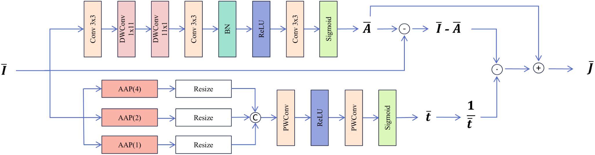 Here, is the hazy image, is the clear image, is the global atmospheric light, is the transmission map, and is the pixel index. When the global atmospheric light is uniform, is expressed as Equation 2: