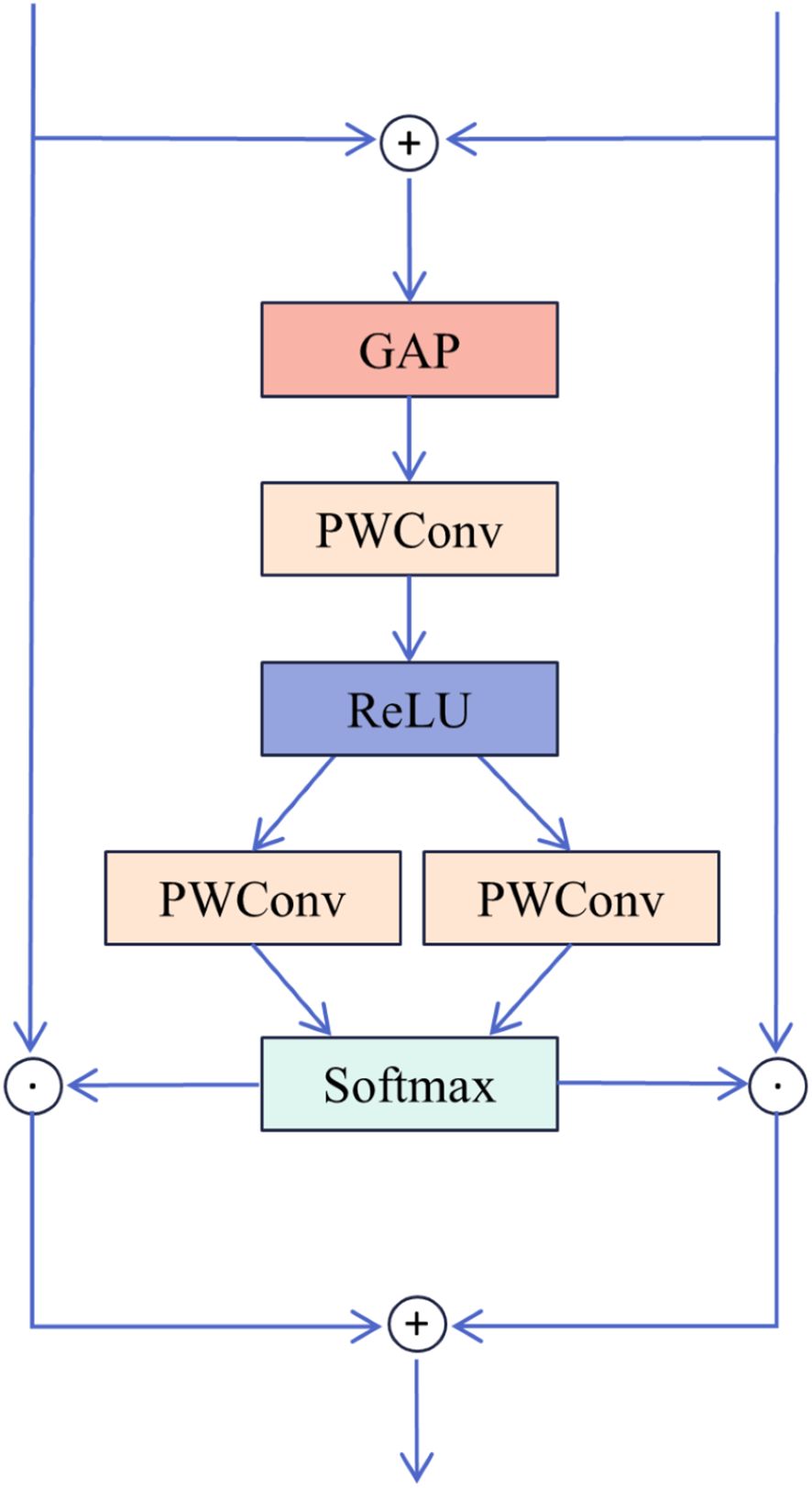 To fuse the dehazed features extracted by DFEU with those from the MixConv module, this study introduces SK Fusion, which is based on the SK module (Li et al., 2019). The structural diagram is presented in Figure 5. The two input features consist of the feature map from the skip connection and the feature map from the main path. Initially, the input features and are added, followed by global average pooling to extract global information for each channel. Next, the MLP module F comprising two PWConv layers and a ReLU activation function, is introduced to generate a more compact feature representation, thus improving the accuracy of adaptive selection. The two PWConv layers perform dimensionality reduction and expansion, enhancing the efficiency of the MLP module. Finally, the obtained fusion weights are processed using the softmax function and a segmentation operation, enabling the weighted selection of different information, as shown in Equations 18, 19. Ultimately, the fused output feature is obtained.