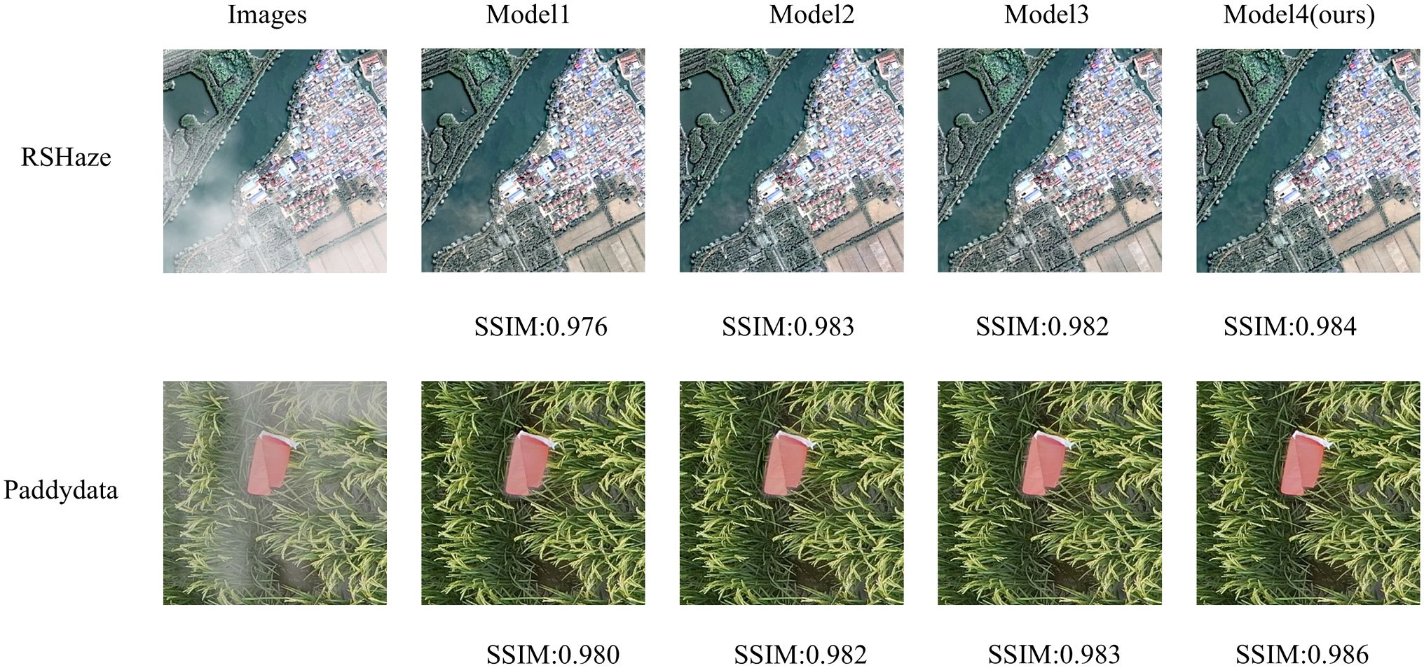 This paper selected one representative image sample from each of the RSHaze and Paddydata datasets for ablation experiments, with results presented in Figure 6. Model2 incorporates MixConv Blocks, demonstrating superior performance to Model1 in distant scenes and hazy regions by preserving greater structural and textural detail. However, residual blurring persists in denser fog areas. Model3, featuring DFEU, exhibits enhanced stability when processing unevenly distributed haze, with more natural transitions at object boundaries. Nevertheless, clarity remains slightly compromised on minute distant structures. Model 4, combining both MixConv Block and DFEU, achieves the most balanced overall performance. It not only effectively reduces extensive haze veils but also demonstrates significant improvements in detail recovery. The image’s colour fidelity and contrast are closer to the real scene, demonstrating the effective integration of multi-scale feature extraction and adaptive path selection, thereby validating the efficacy of module combination.