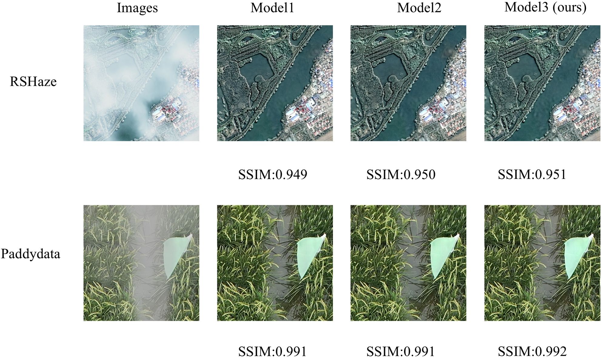 This paper selected one representative image sample each from the RSHaze and Paddydata datasets for ablation experiments, with results presented in Figure 7. Model1, failing to adequately account for the spatial non-uniformity of the transmission map, often exhibits residual haze veils in distant regions and blurred boundaries within the test images. Model2 employs dual-branch paths to model atmospheric light and transmission maps separately, yielding more natural overall colouration and improved edge clarity for foreground objects compared to FDU. However, it still exhibits insufficient detail in localised areas and extensive dense fog zones. Model 3, the proposed model in this paper, further incorporates an adaptive mechanism. In the test images, it not only restores colours more accurately in complex regions such as terrain boundaries but also maintains good clarity in fine textures and distant structures. Simultaneously, it avoids over-restoration in clear areas, achieving the optimal overall image depth and naturalness.