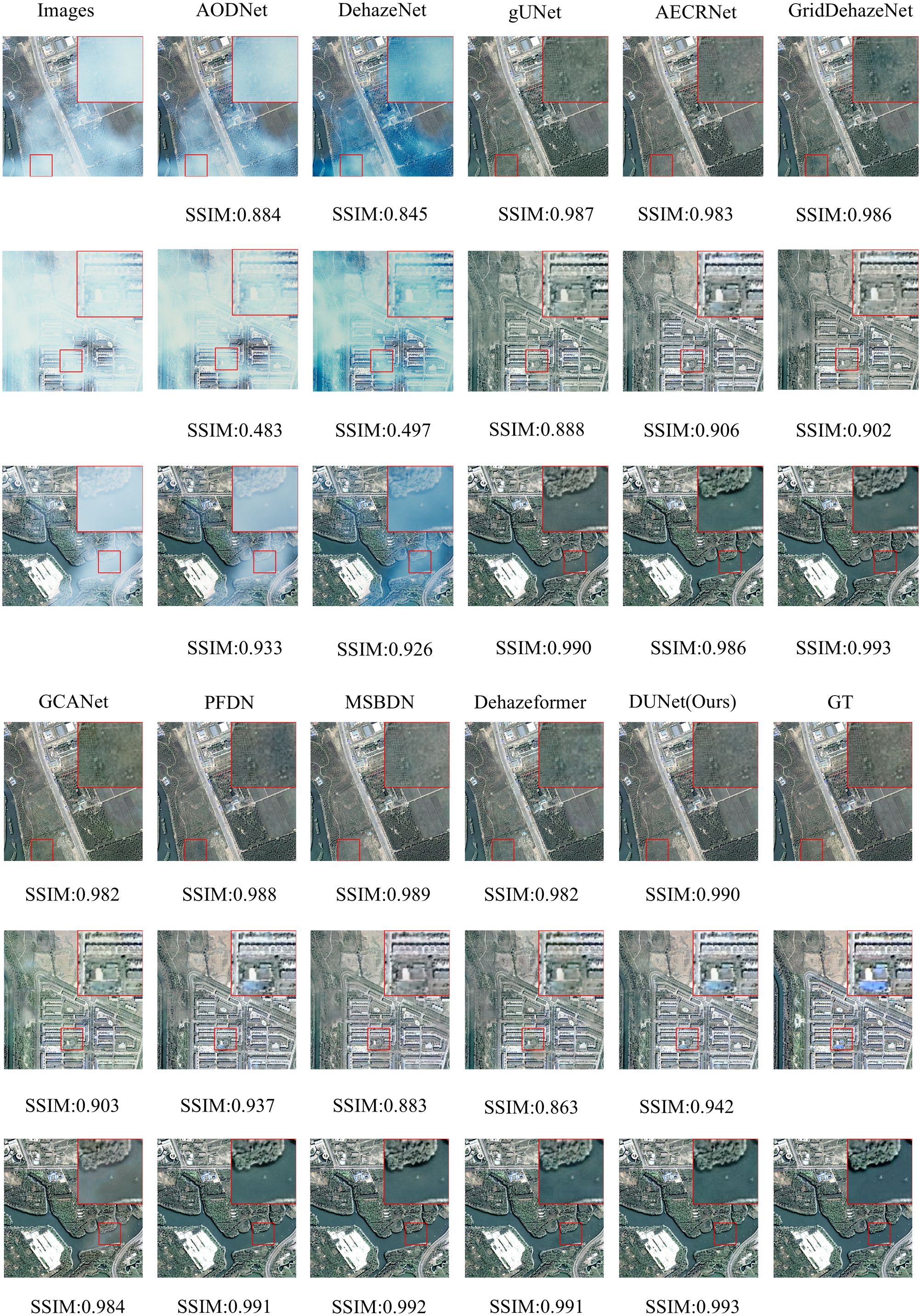 We selected three representative samples from the RSHaze dataset, which cover different haze concentrations in remote sensing images. Additionally, we chose three representative samples from the Paddydata dataset, containing images with varying haze concentrations collected from rice fields. These samples were qualitatively analyzed to assess the performance differences of various methods in handling segmentation accuracy, robustness, and adaptability to complex scenarios. In the selected test images, we focused on representative areas, such as color-rich regions and heavily hazy zones, and observed the dehazing performance of different models. Figure 8 and Figure 9 provide a qualitative comparison between DUNet and other dehazing models.