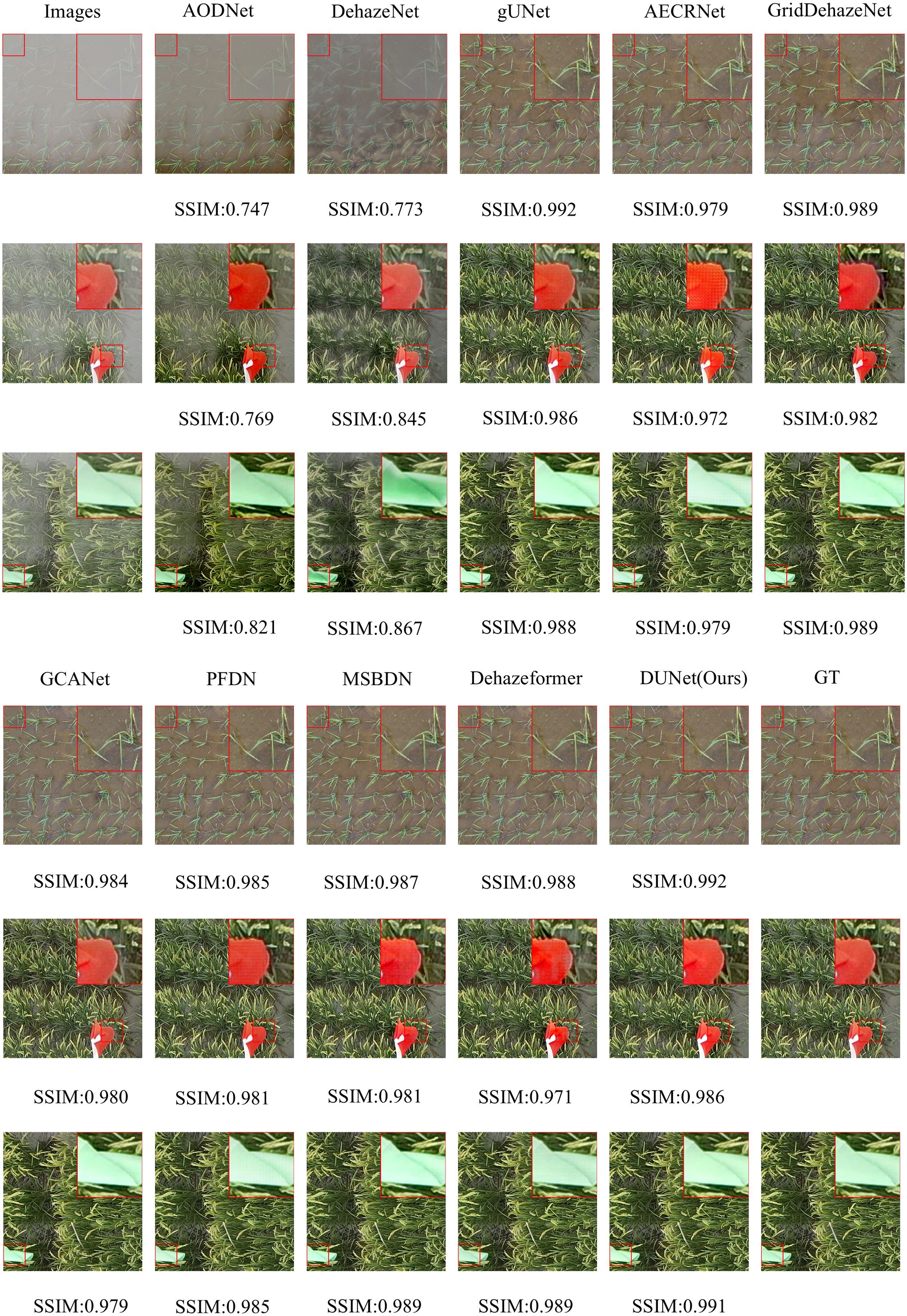 For the Paddydata dataset, AODNet and DehazeNet encounter the same issue. The processed paddy field images still retain some haze, which is easily noticeable, and fail to achieve effective haze removal. gUNet, AECRNet, and GCANet exhibit similar dehazing performance, however, they still show significant shortcomings in handling the edges of object details, such as the colored flag markers in the paddy fields. As shown in Figure 9, after processing, the edges of the flag markers still display haze features, resulting in blurry details in the output image. Furthermore, due to the residual haze, color recovery is also insufficient. GridDehazeNet, PFDN, and MSBDN further improve dehazing performance. However, they still exhibit artifacts at object edges, and the bright regions of the restored images remain slightly obscured by haze. The introduction of an improved Transformer Block in Dehazeformer leads to significant advancements in feature handling, making it second only to DUNet in terms of dehazing performance. Nevertheless, color compensation remains slightly skewed, showing deviations from the original clear images, and slight haze still lingers in certain details, such as the paddy stalks. Finally, as shown in Figure 9, DUNet outperforms all other models in haze removal, excelling in both object edge details and vibrant color regions. It restores sharper edges and handles detailed elements like paddy stalks and colored flags with the best performance.