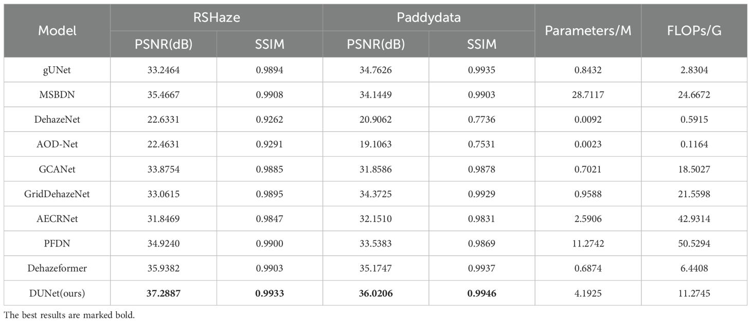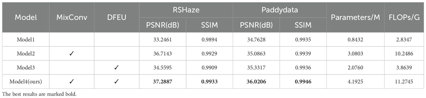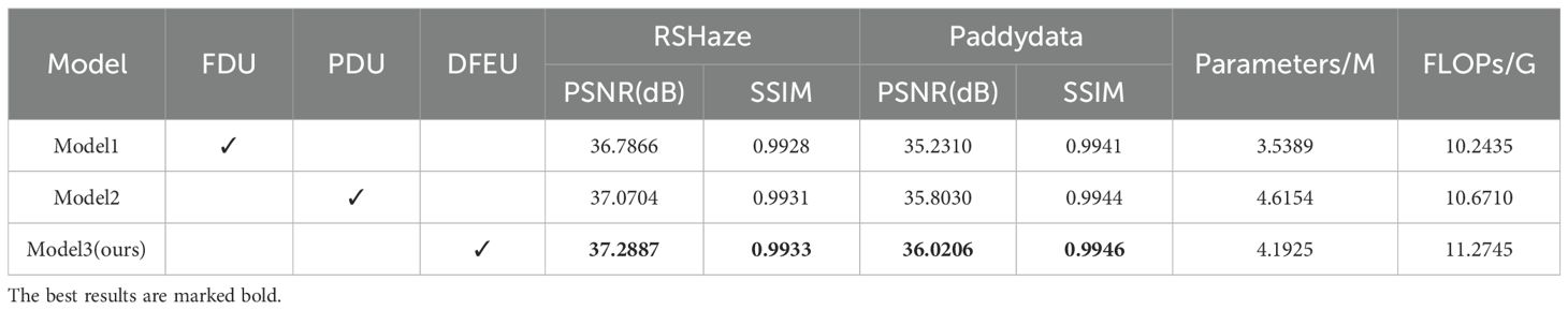 In this study, due to the significant non-uniform distribution of haze in remote sensing images, haze removal is frequently regarded as a classic non-uniform image dehazing problem. Therefore, this study assessed the performance of the proposed model in haze removal using the RSHaze remote sensing dataset. Additionally, the model’s dehazing performance in outdoor agricultural settings was validated using the Paddydata paddy field haze dataset. Through a series of ablation experiments, the performance of each module in the network was tested on both datasets, gradually adding modules to observe their specific effect on network performance. Additionally, we compared the dehazing performance of the proposed DFEU with that of the FDU and PDU models.