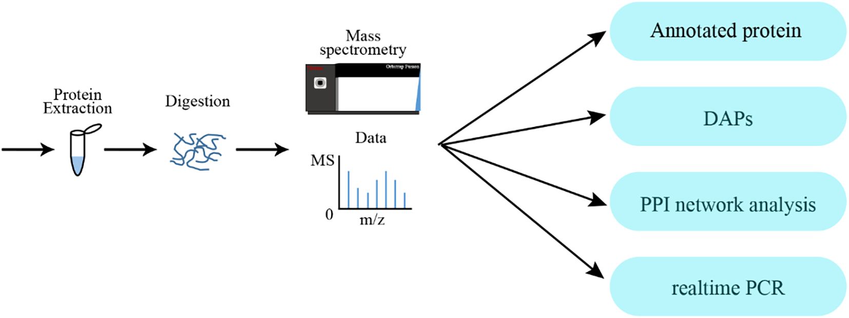 Flowchart depicting a protein analysis process. It begins with protein extraction, followed by digestion. Mass spectrometry analyzes the digested proteins, producing data with an MS spectrum graph. The data leads to four outcomes: annotated protein, differentially abundant proteins (DAPs), protein-protein interaction (PPI) network analysis, and real-time PCR.