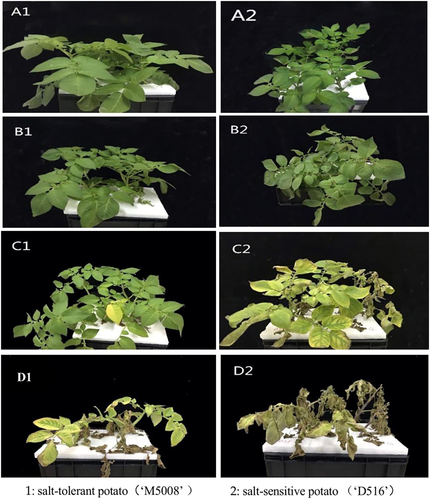 Salt-tolerant potato (M5008) and salt-sensitive potato (D516) plants are compared in four stages (A to D). A1 and A2 show healthy plants. B1 and B2 indicate slight yellowing. C1 and C2 exhibit increased yellowing. D1 and D2 display significant wilting, with D2 being more severe.