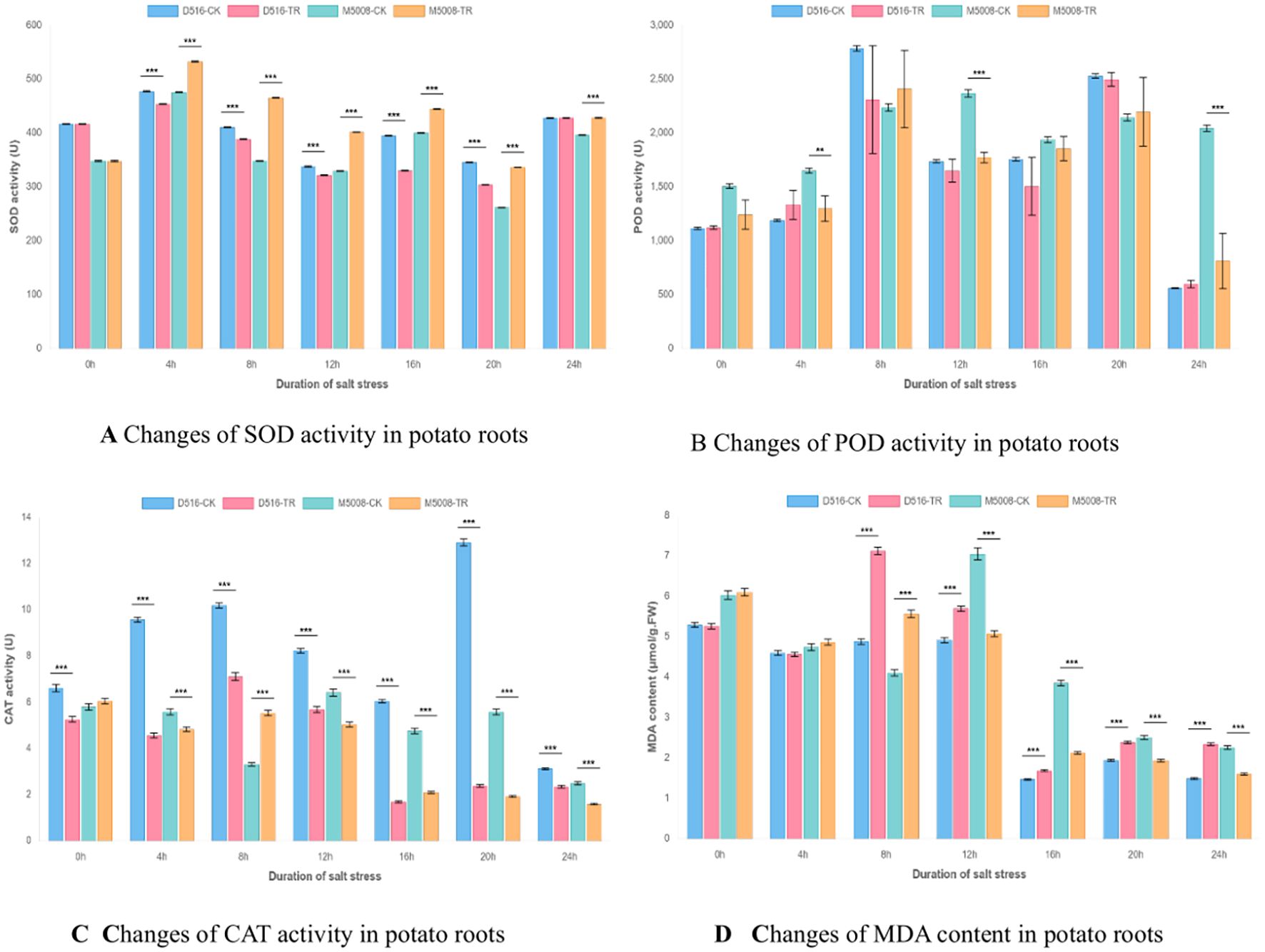 Figure 3. Dynamic changes in antioxidant enzyme activities and lipid peroxidation in potato cultivars under salt stress. (A) Superoxide dismutase (SOD) activity. (B) Peroxidase (POD) activity. (C) Catalase (CAT) activity. (D) Malondialdehyde (MDA) content. Data are presented for four treatments: D516 control (D516-CK), D516 salt-treated (D516-TR), M500B control (M500B-CK), and M500B salt-treated (M500B-TR). Significant differences between control and treated groups at the same time point are indicated by asterisks (*p < 0.05, **p < 0.01, ***p < 0.001).