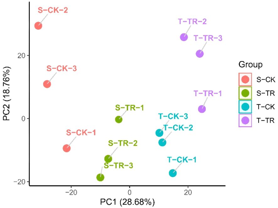 Scatter plot showing PCA analysis with PC1 (28.68%) on the x-axis and PC2 (18.76%) on the y-axis. Data points are grouped by color: red for S-CK, green for S-TR, blue for T-CK, and purple for T-TR. Each group has three labeled points, indicating clustering patterns.
