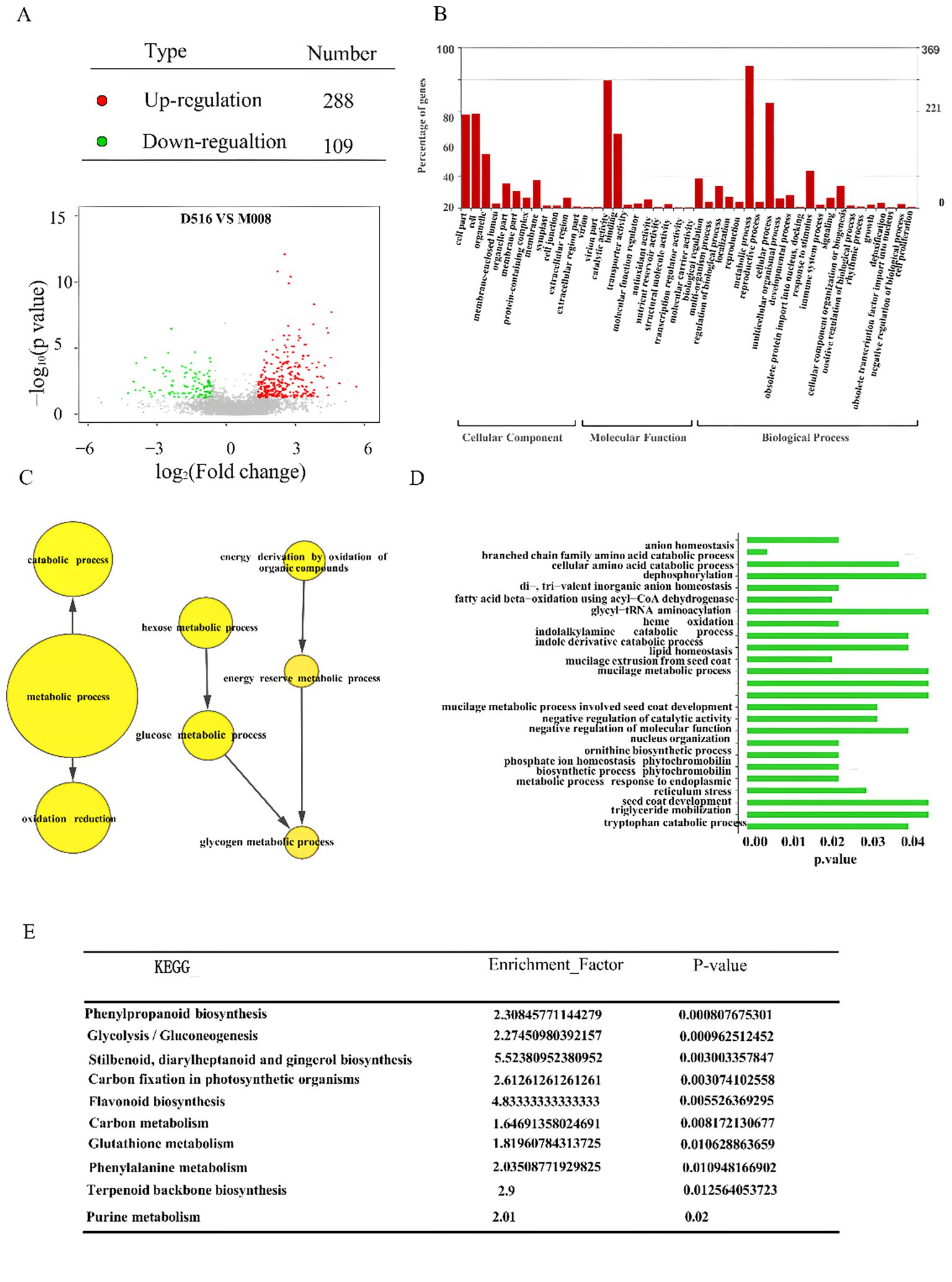 A multi-panel image presents various analyses related to gene expression. Panel A shows a scatter plot with a legend indicating 288 up-regulated (red) and 109 down-regulated (green) genes, comparing D516 versus M008. Panel B is a bar chart showing the distribution of gene percentages across cellular components, molecular functions, and biological processes. Panel C is a network diagram illustrating relationships between metabolic processes. Panel D features a horizontal bar chart displaying p-values for metabolic pathways, highlighting areas like amino acid catabolic processes. Panel E lists KEGG pathway enrichments with factors and p-values, indicating significant pathways.