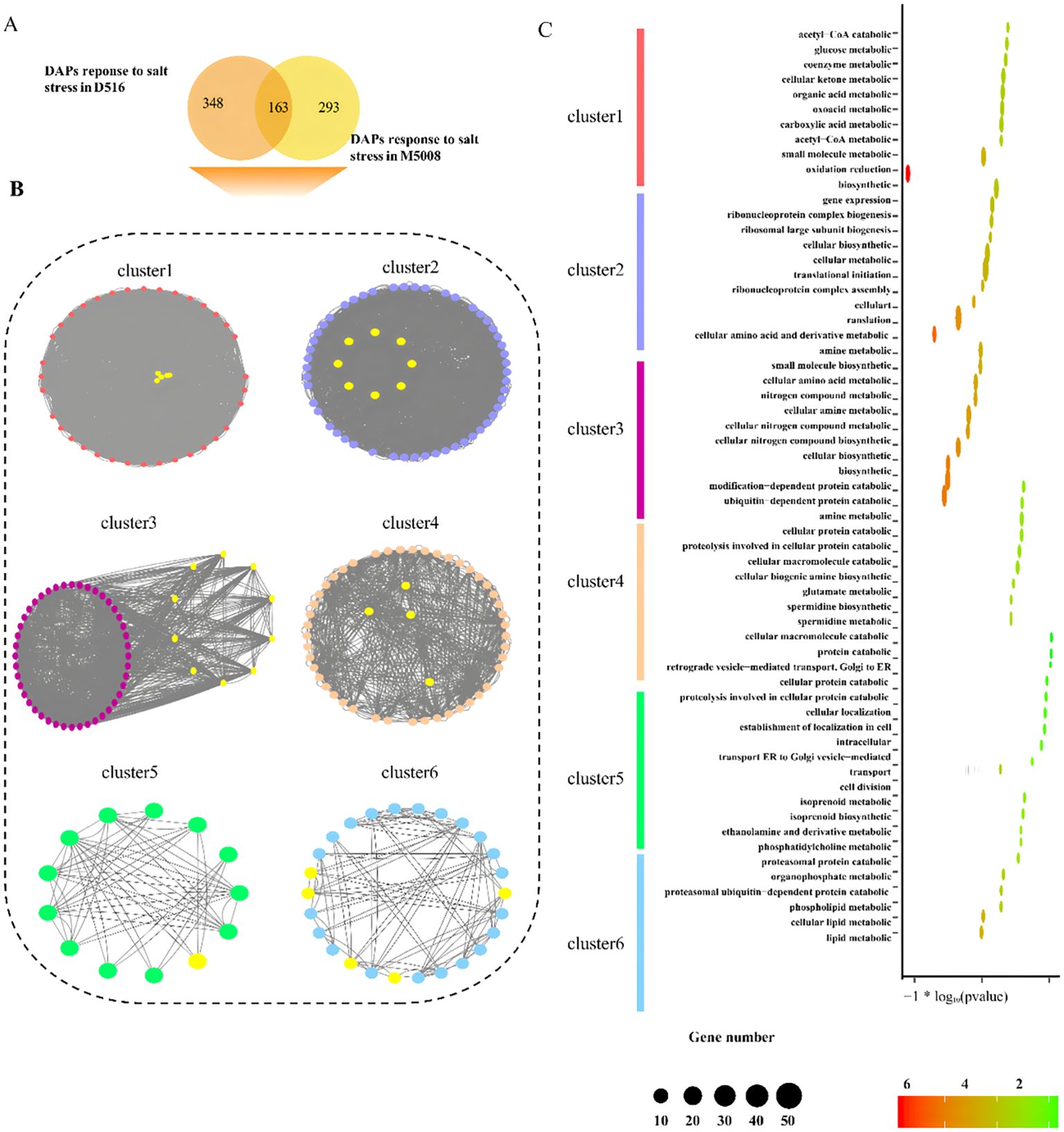 Venn diagram, cluster graphs, and bar plot. A: Venn diagram showing overlap of DAPs response to salt stress in D516 and M5008. B: Network clusters 1-6, nodes in yellow, with varying edge connectivity. C: Bar plot with color-coded pathways, showing gene number and significance level, represented by log-transformed p-values.
