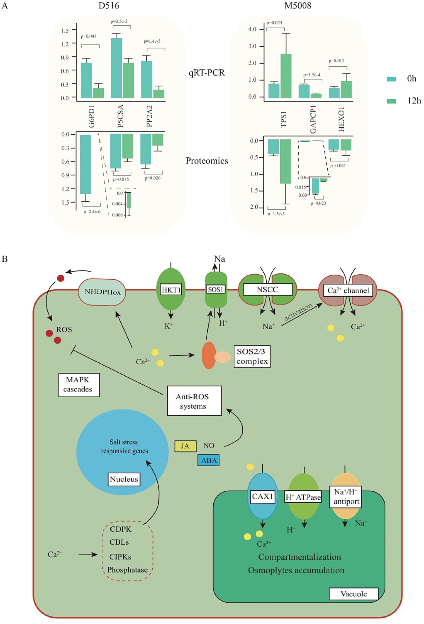 Diagram with two sections. A: Two graphs showing qRT-PCR and proteomics data for D516 and M5008 at 0 and 12 hours. Significant p-values are indicated. B: A schematic of cellular mechanisms managing oxidative stress, showing pathways and interactions involving ROS, MAPK cascades, anti-ROS systems, and ion channels (e.g., HKTI, SOS1, NSCC). Shows components like salt stress-responsive genes, Ca2+ channels, and SOS2/3 complex.