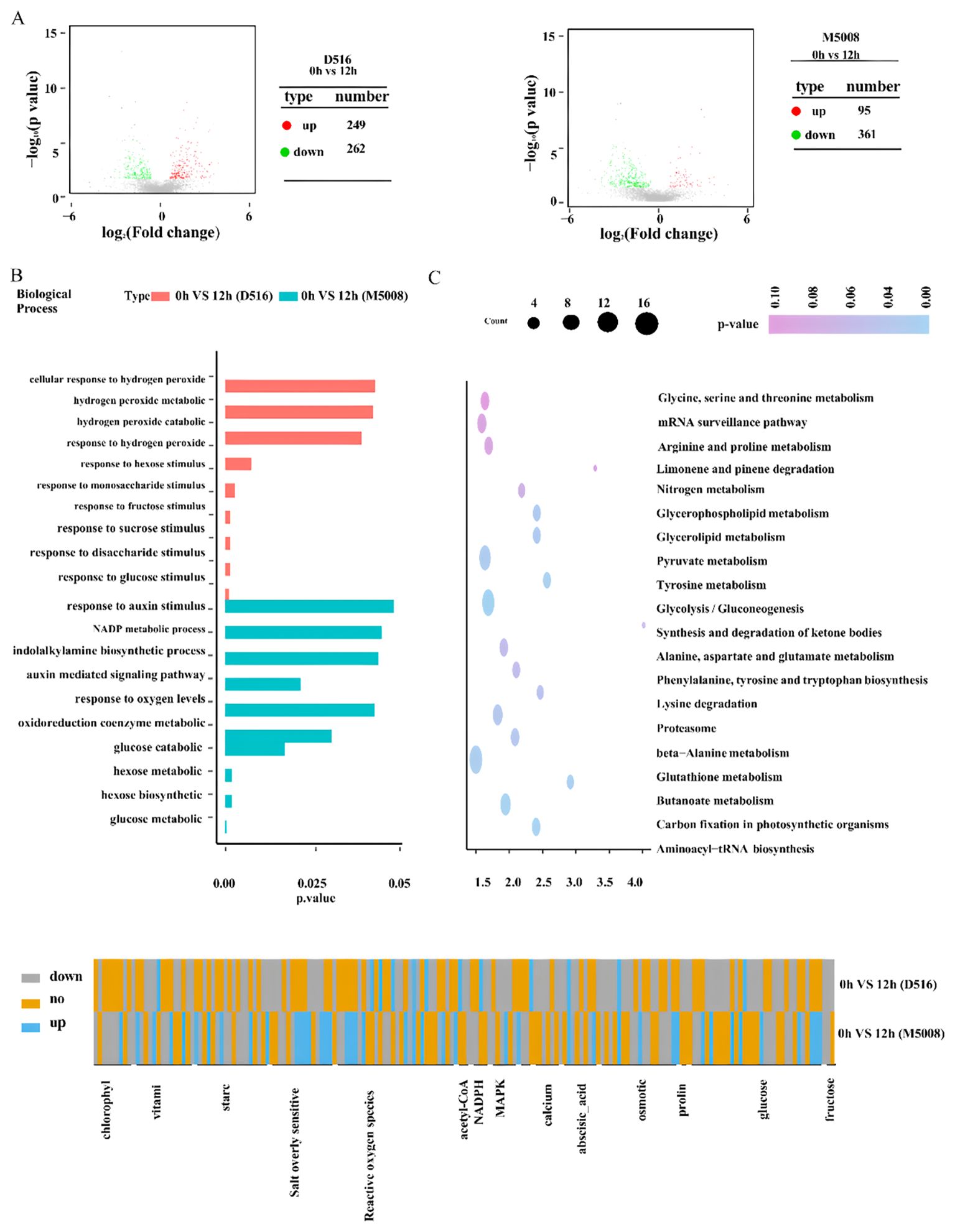 As expected, the ‘M5008’ cultivar exhibited a higher salt resistance trait (Figure 2). Compared to the control, the leaves of ‘D516’ cultivar turned yellow while the leaves of ‘M5008’ cultivar had a stay-green phenotype at 12 h post salinity treatment.
