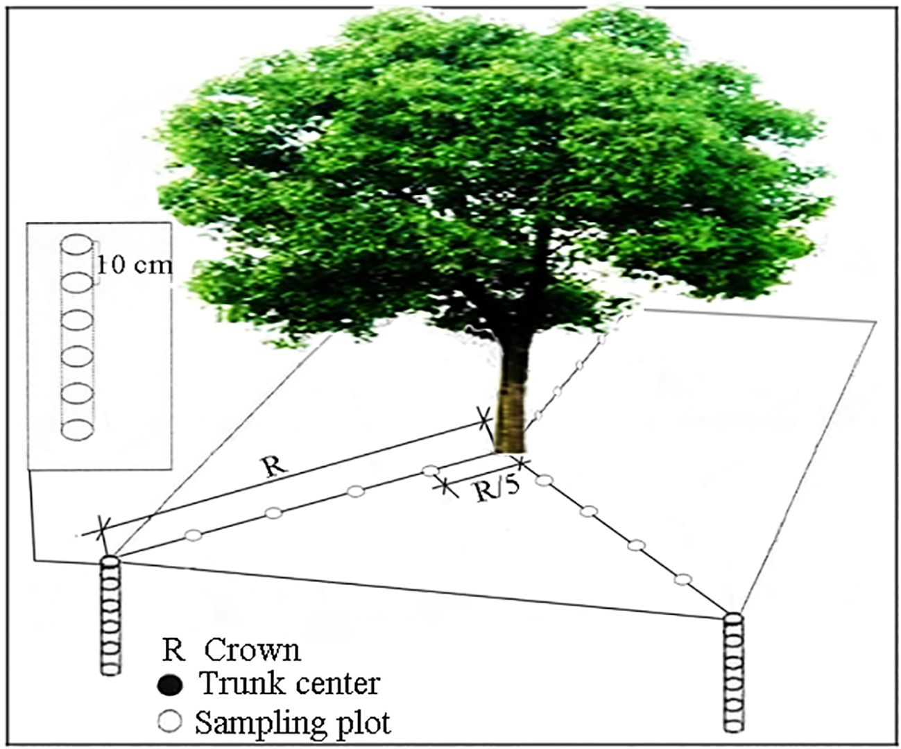 Sampling Method: For each species, soil cores were collected using a root auger (internal diameter φ =5.0 cm, height H = 10 cm) at five equidistant points (30 cm intervals) along three radial directions from the trunk center to the canopy edge, with a sampling boundary at 1.5 m from the trunk. Soil samples were taken at 50 cm depth, divided into five layers (0–10 cm, 10–20 cm, 20–30 cm, 30–40 cm, 40–50 cm) (Figure 2; Jian et al., 2015). Soil electrical conductivity (EC) and temperature were measured in situ for each layer using a calibrated electrical conductivity Tester 11+ (Spectrum Technologies Inc., USA). Three soil cores from the same layer and distance were pooled to extract roots, and a composite soil sample was collected. Roots and soil samples were labeled, stored in sealed bags, and transported to the laboratory for analysis. The remaining soil was backfilled into the original holes. The collection of root and soil samples was completed between the 5th and 7th days of each even month under rainless and snowless weather conditions, with the sampling period lasting from February 2018 to February 2019.