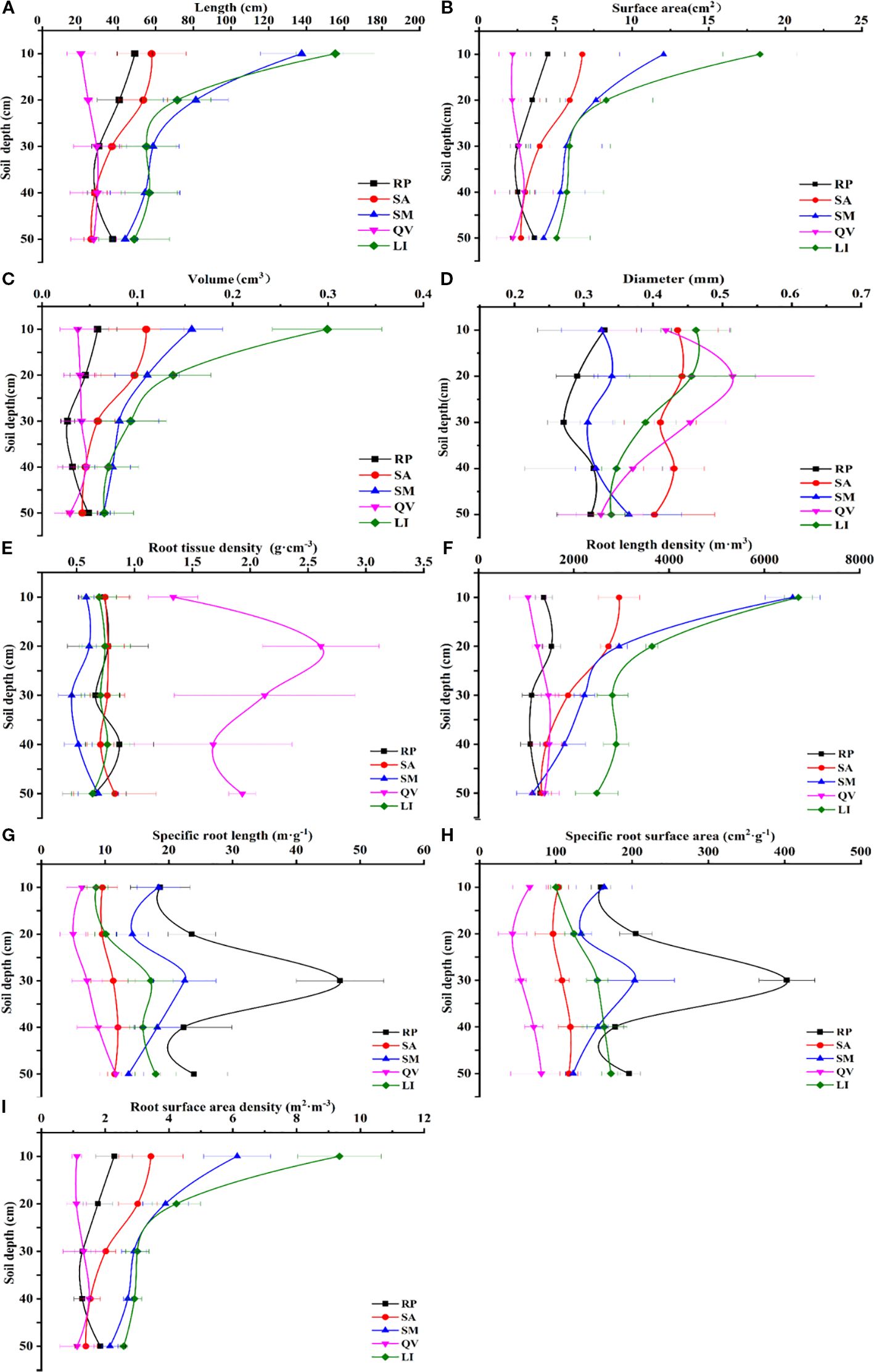 Figure 3. The changes of fine root morphological characteristics of different tree species in different soil depths. (a) fine root length, (b) fine root surface area, (c) fine root volume, (d) fine root diameter, (e) fine root tissue density, (f) fine root length density, (g) specific root length, (h) specific root surface area, (i) root surface area density. RP, Robinia pseudoacacia; SA, Sapium sebiferum; SM, Salix matsudana; QV, Quercus virginiana; LI, Ligustrum lucidum.