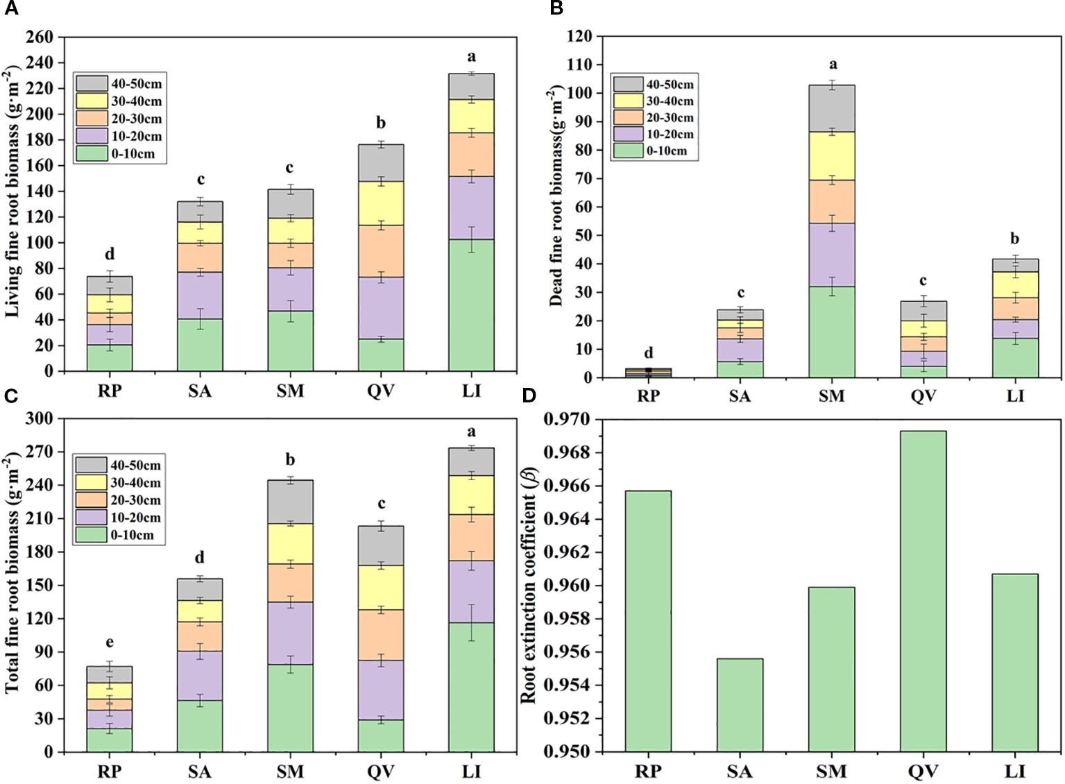 Figure 4. Comparison of the fine root biomass in different tree species. (a) living fine root biomass, (b) dead fine root biomass, (c) total fine root biomass, (d) root extinction coefficient. RP, Robinia pseudoacacia; SA, Sapium sebiferum; SM, Salix matsudana; QV, Quercus virginiana; LI, Ligustrum lucidum. There was significant difference in cumulative biomass of different tree species with different letters, but there was no significant difference with the same letter (P< 0.05).