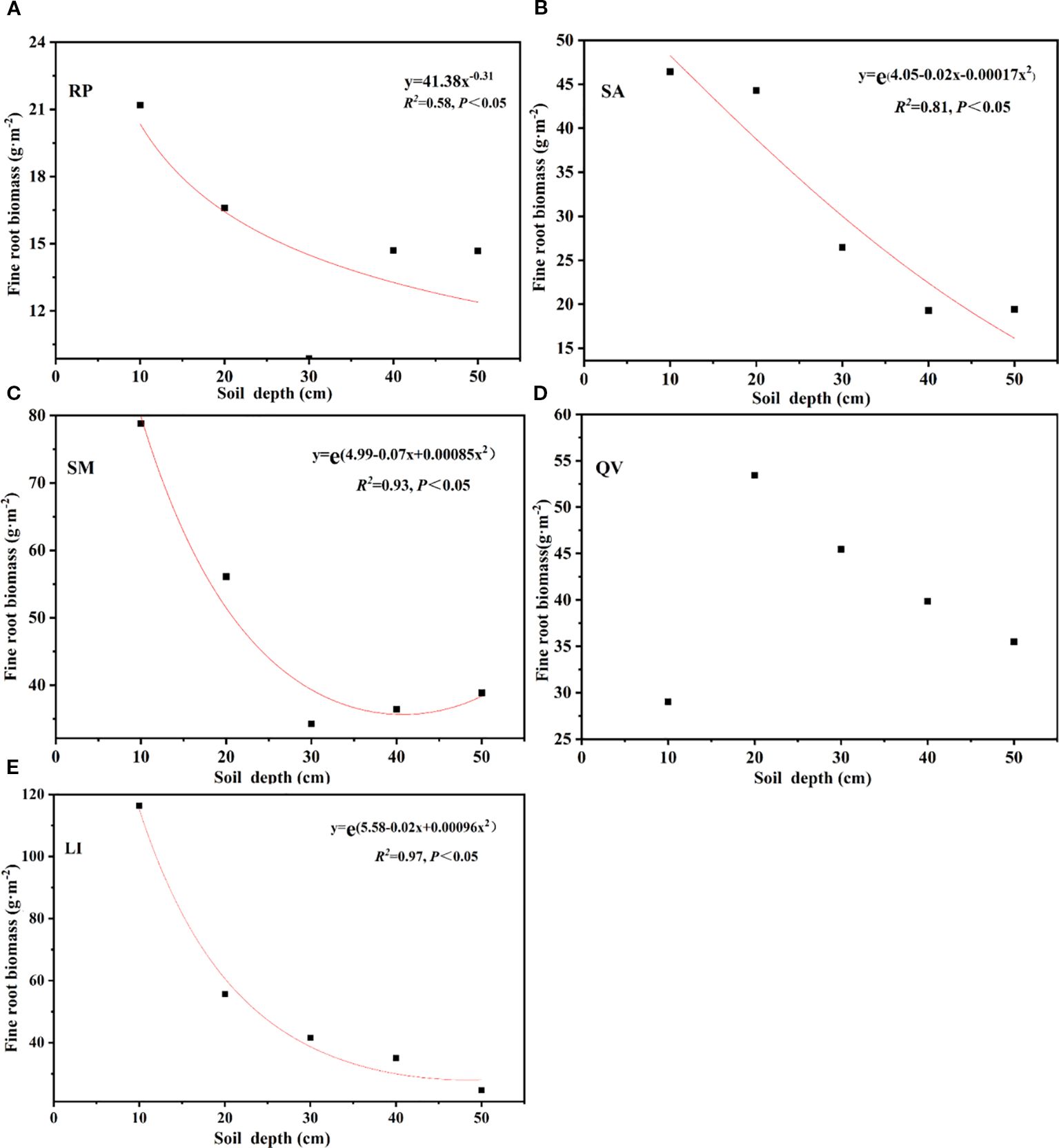 Figure 5. Fitting function of fine root biomass of different tree species with the soil depth. (a) RP, (b) SA, (c) SM, (d) QV, (e) LI. RP, Robinia pseudoacacia; SA, Sapium sebiferum; SM, Salix matsudana; QV, Quercus virginiana; LI, Ligustrum lucidum.