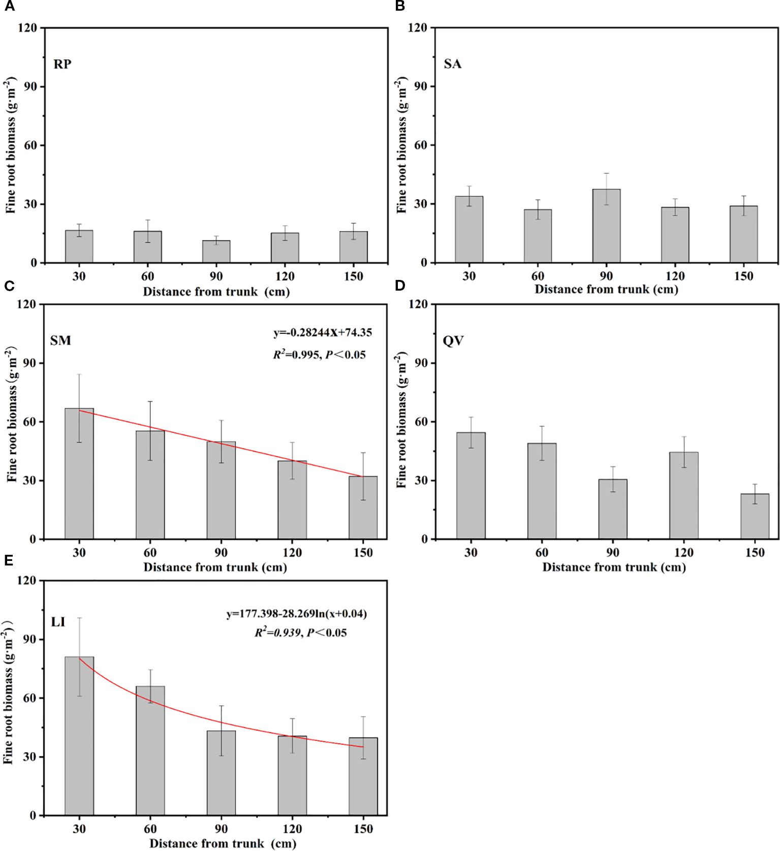 The horizontal distribution patterns of fine root biomass among the five tree species revealed distinct spatial characteristics: SM, QV, and LI exhibited progressively decreasing fine root biomass with increasing distance from the trunk, with SM showing a linear reduction (R²=0.98, P<0.05) and LI following a logarithmic decline (R²=0.939, P<0.05) from the trunk center to the canopy edge (Figure 6c, e). In contrast, SA demonstrated a unique pattern with peak biomass (37.58 g·m-2) at 90 cm from the trunk (Figure 6b), while RP generally decreased with distance but displayed an anomalous minimum (11.41 g·m-2) at the 90 cm position, indicating species-specific horizontal distribution strategies in coastal saline soils (Figure 6a).