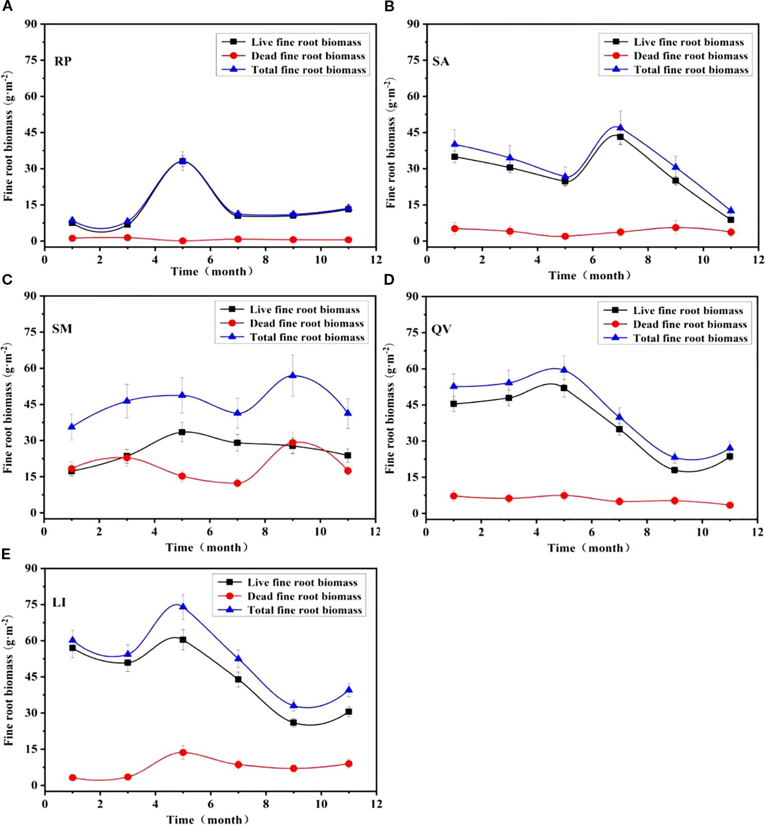 Figure 7. Temporal dynamics of fine root biomass in different tree species. (a) RP, (b) SA, (c) SM, (d) QV, (e) LI. RP, Robinia pseudoacacia; SA, Sapium sebiferum; SM, Salix matsudana; QV, Quercus virginiana; LI, Ligustrum lucidum.