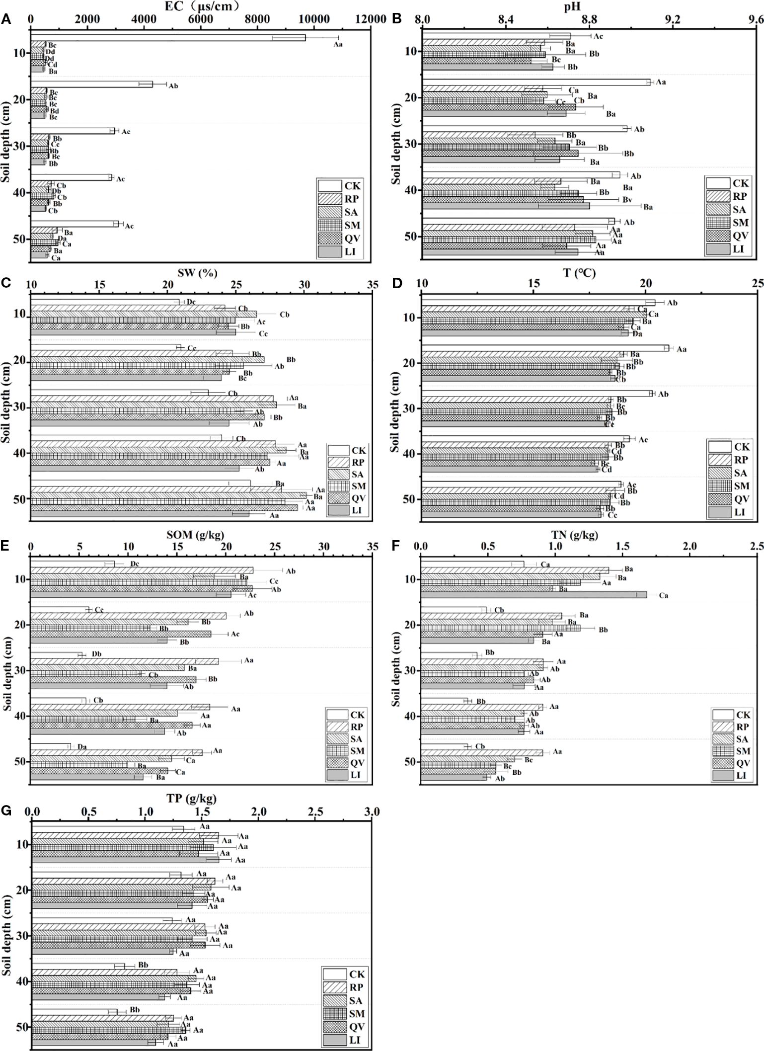 Figure 8. Distribution of soil properties in sample plots of different tree species. (a) electrical conductivity, (b) pH, (c) soil water, (d) temperature, (e) soil organic matter, (f) total N, (g) total. RP, Robinia pseudoacacia; SA, Sapium sebiferum; SM, Salix matsudana; QV, Quercus virginiana; LI, Ligustrum lucidum; EC, Electrical conductivity; SW, Soil water; T, Temperature: SOM, Soil organic matter: TN, Total N; TP, Total P. Different capital letters indicate the significant differences in soil physical and chemical properties between different communities at the same soil depth; and different lowercase letters indicate the significant differences in soil physical and chemical properties between different communities at the same soil depth (P< 0.05).