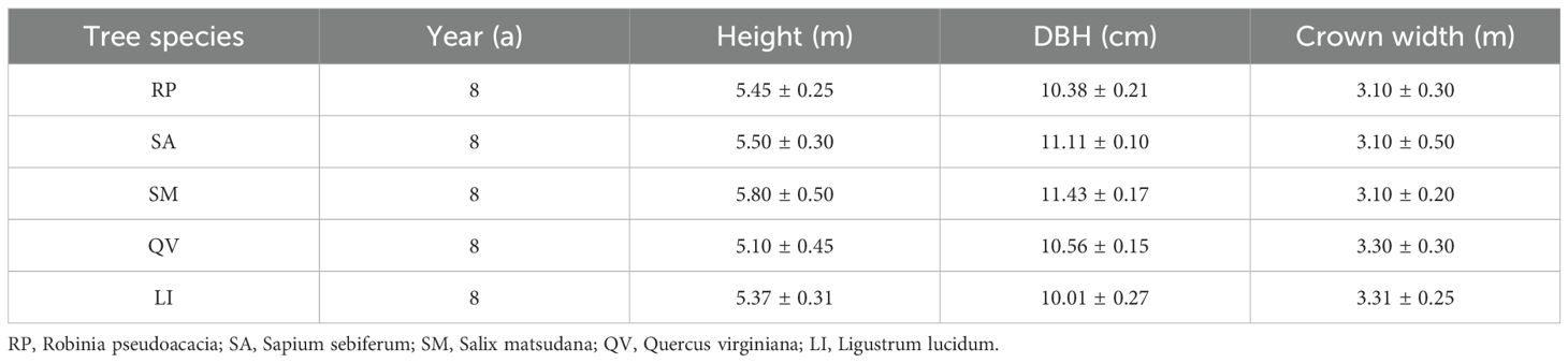 Species Selection: In January 2018, two evergreen species (QV, LI) and three deciduous species (RP, SA, SM) were selected based on life forms. The five species had comparable mean tree height, diameter at breast height, and crown width (Table 1). Three trees per species were sampled as experimental replicates, spaced ≥15 m apart to avoid root interference. Herbaceous plants were manually removed throughout the experiment to eliminate their impact on root growth and sampling.