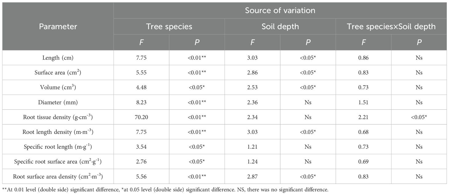Table 2. Results of ANOVA of the effects of tree species and soil depths on the morphological characteristics of fine roots.