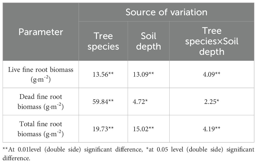 Significant differences (P<0.01) were observed among tree species in live fine root biomass, dead fine root biomass and total fine root biomass (Table 3). Significant differences were also found across soil layers for live fine root biomass and total fine root biomass (P<0.01), while dead biomass varied significantly (P<0.05). The interaction between tree species and soil depth significantly affected live fine root biomass and total fine root biomass (P<0.01) and dead fine root biomass (P<0.05) (Table 3).