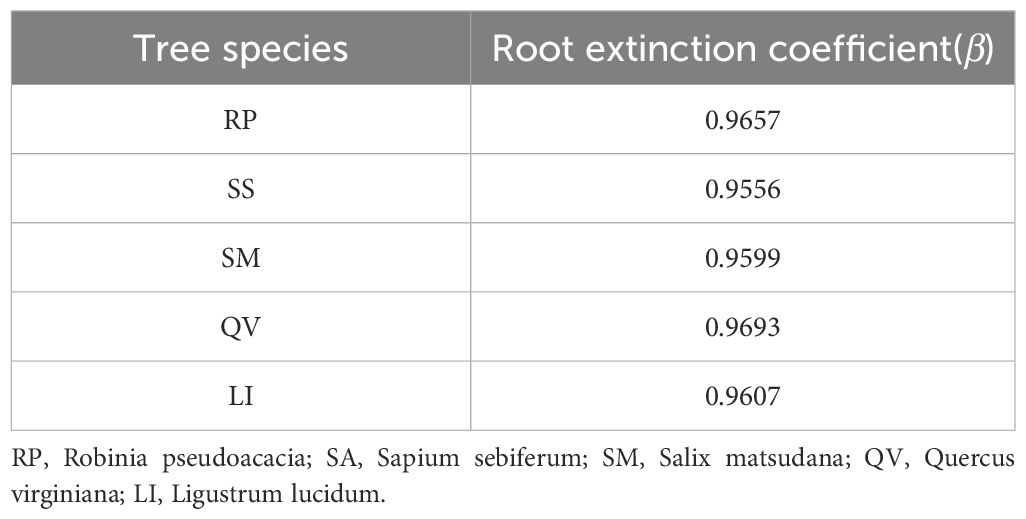 where Y is cumulative percentage of root biomass from the surface to depth d (cm). The β value mainly represents the relationship between the vertical distribution of the root system and the depth of the soil layer. A higher β value indicates greater root biomass in deeper soil layers. A smaller β value indicates that the plant root system is closer to the surface soil layer.