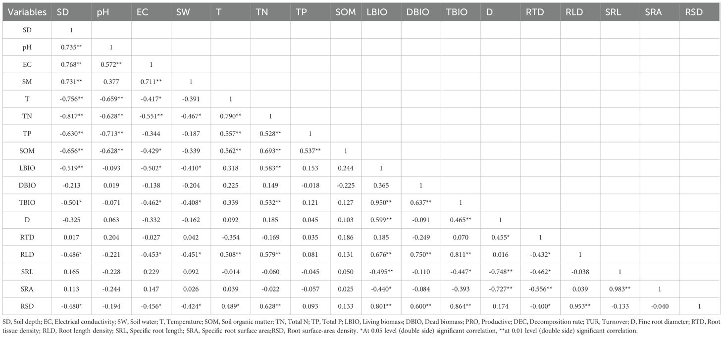 The biomass of living fine roots had an extremely significant negative correlation with soil layer depth (P< 0.01), a significant negative correlation with electrical conductivity and soil water (P< 0.05), and an extremely significant positive correlation with total nitrogen (P< 0.05). The biomass of dead fine roots was negatively correlated with soil layer depth, electrical conductivity, soil water, total phosphorus and soil organic matter, and positively correlated with pH, temperature and total nitrogen, but all these correlations were not significant.
