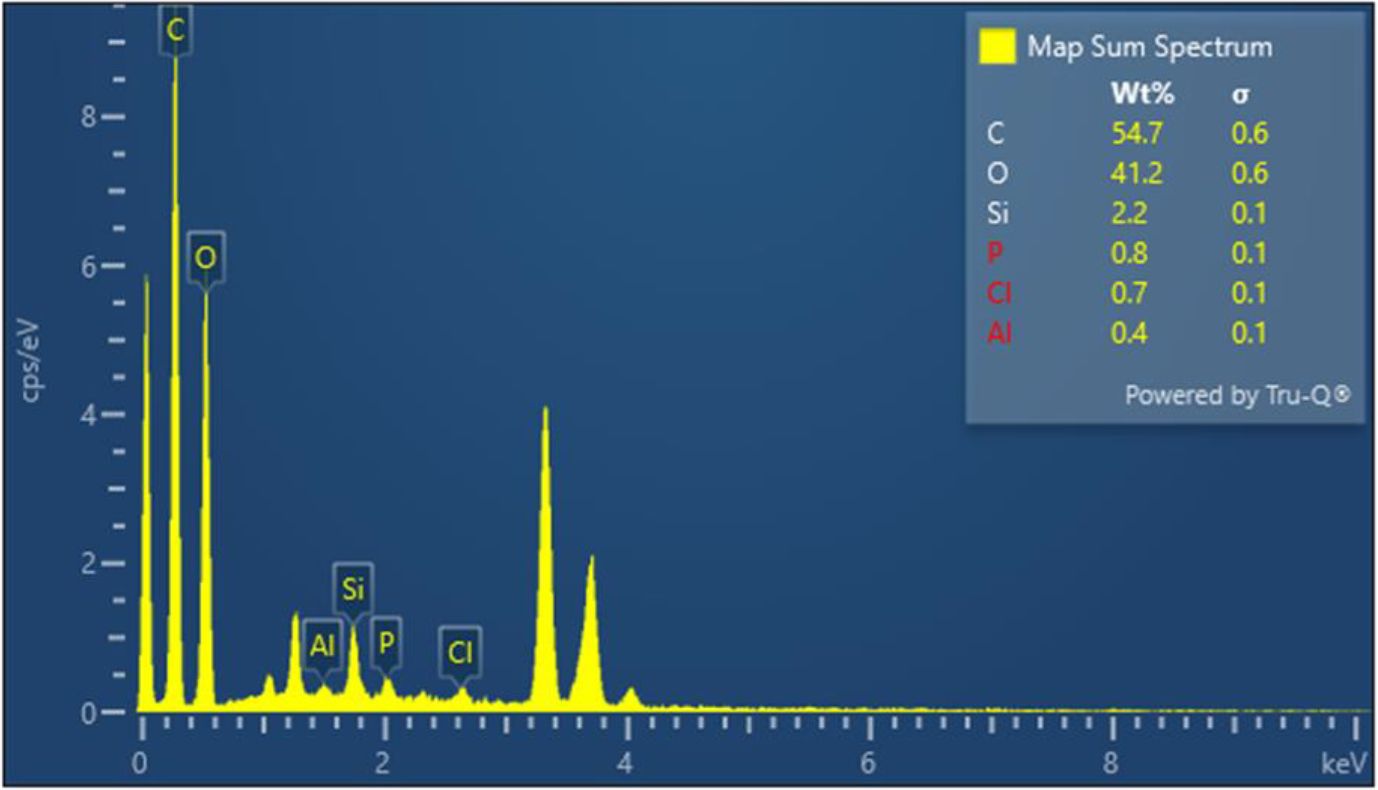 The elemental composition of the WS biochar was determined using Energy Dispersive X-ray Spectroscopy (EDX) coupled with SEM. The EDX spectrum (Figure 2) revealed distinct peaks corresponding to major elements: Carbon (C: 54.7%) and Oxygen (O: 41.2%). Minor/trace elements include Silicon (Si), Potassium (K), Calcium (Ca), Chlorine (Cl), and Aluminum (Al). The high carbon content (54.7%) confirms effective carbonization during pyrolysis, while the moderate oxygen content (41.2%) suggests retention of oxygenated functional groups (e.g., carboxyl, hydroxyl). This composition aligns with typical lignocellulosic biochars, where C% >50% indicates successful conversion of biomass into stable carbon matrices (Lehmann et al., 2011). O% ~40% reflects partial oxidation or inherent biomass lignin-oxygen bonds.