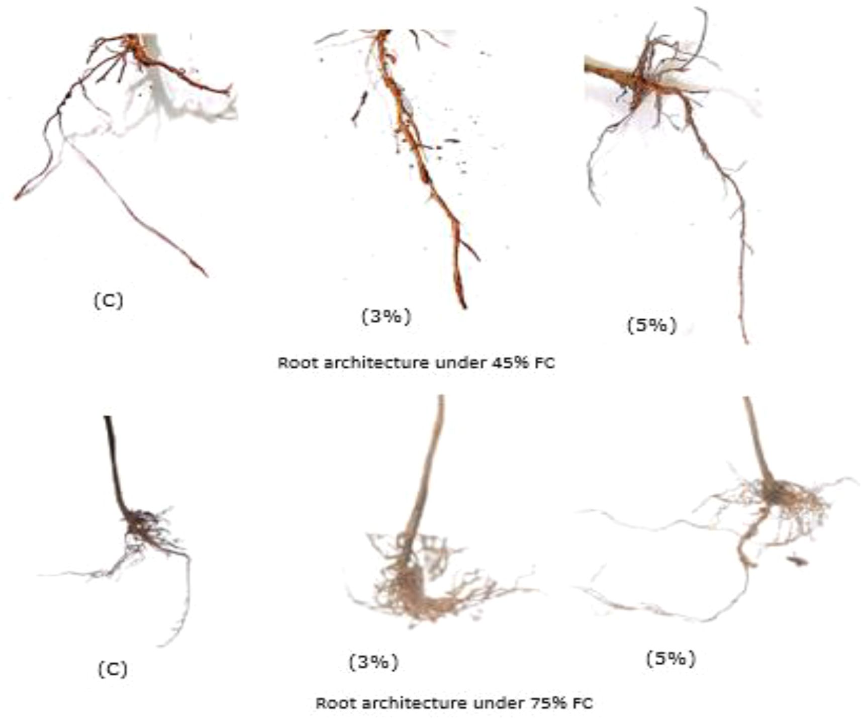 Drought stress represents one of the most significant environmental constraints affecting plant growth and development, profoundly altering various morphological and physiological processes (Afaf et al., 2023). Our observations revealed that biochar application significantly improved root system architecture under drought conditions. Compared to the non-amended control (0% biochar), plants treated with walnut shell biochar exhibited enhanced root elongation, with the most pronounced effects occurring at 5% biochar application under both moderate (45% FC) and severe (75% FC) drought stress (Figure 4). These findings align with previous reports demonstrating 34-35% increases in root length under drought conditions following biochar amendment (Khodabakhshi et al., 2023).